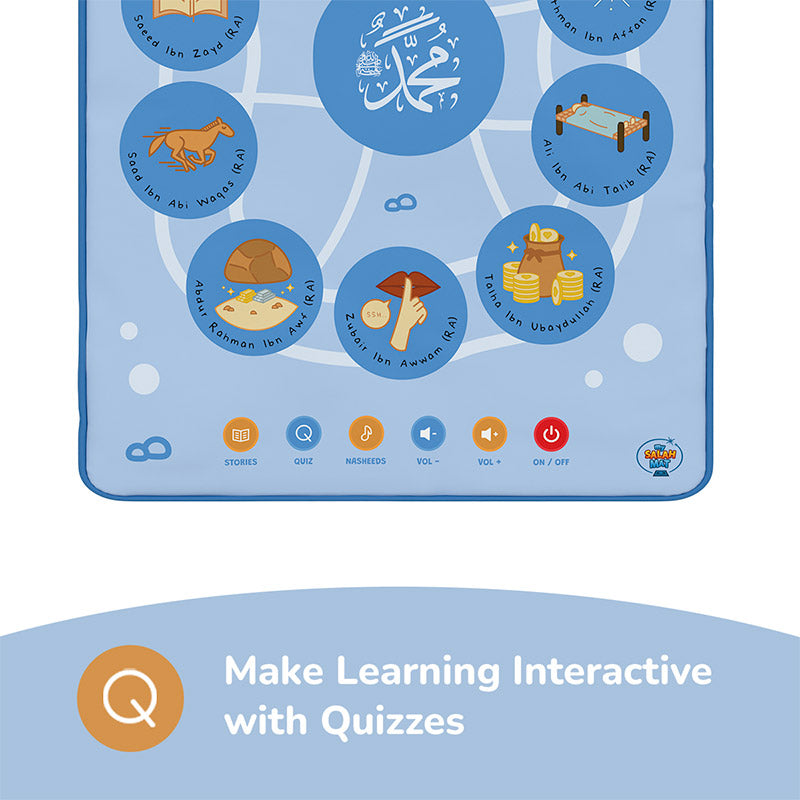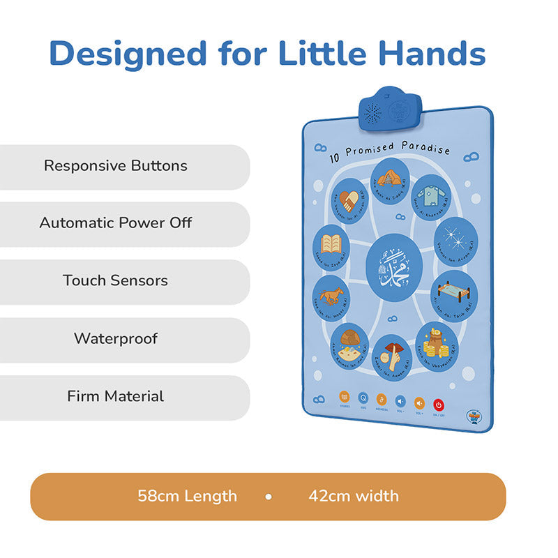 Take a journey through the lives of ten of the most honoured companions of the Prophet ﷺ — from the wisdom of Abu Bakr (RA) to the courage of Zubair Ibn Awwam (RA). The 10 Promised Paradise Audio Mat & Wall Art beautifully illustrates their stories, helping children and families build a memorable connection to their legacy, wherever they are.