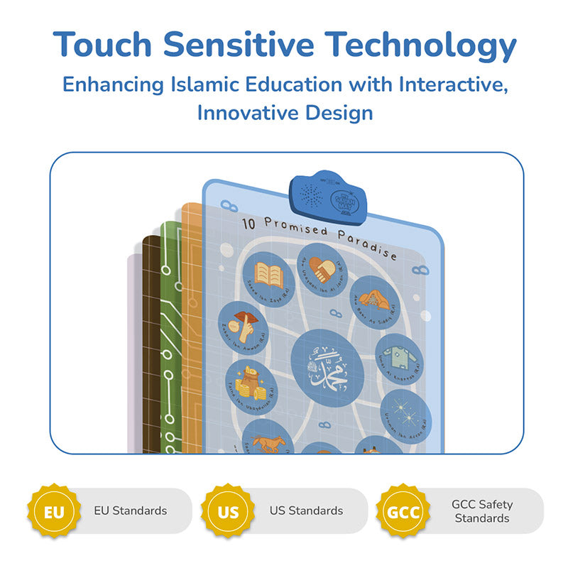 Using touch-sensitive technology and a handy remote control, children and families can listen to the inspiring stories of the 10 blessed companions who were promised Jannah by the Prophet Muhammad ﷺ. Fun quizzes and uplifting nasheeds make it easy to learn, remember, and love their legacy.