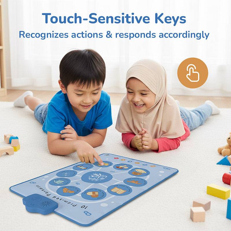 The Interactive Islamic Audio Mat & Wall Art is a touch-activated learning companion designed for every space your child learns and plays. Lay it on the floor for interactive story time, place it on the table for quizzes and nasheeds, or mount it on the wall for beautiful, hands-free learning. Wherever you put it, Islamic history comes to life at the touch of a button.