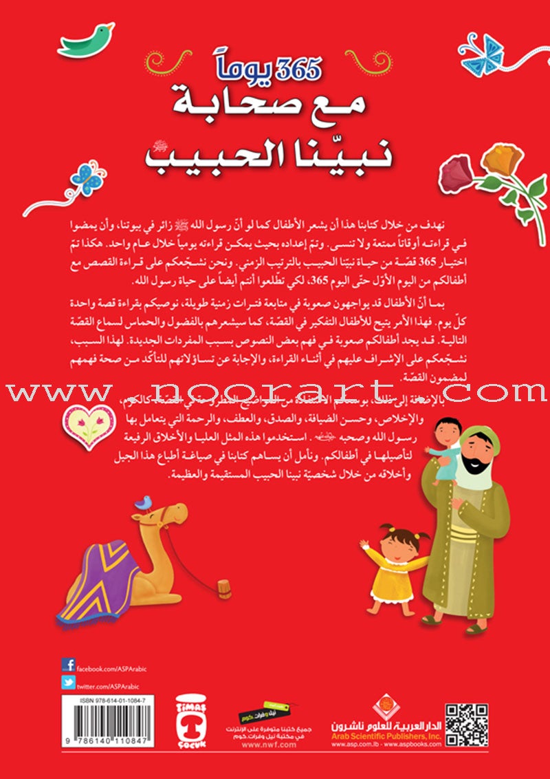 إلى ذلك، يهدف الكتاب إلى أن يشعر الأطفال كما لو أن رسول الله (صلى الله عليه وسلم) زائر في بيوتنا، وأن يمضوا في قراءته أوقاتاً ممتعة ولا تنسى.. هكذا تمّ اختيار 365 قصة من حياة نبيّنا الحبيب بالترتيب الزمني. ونتوجه بكتابنا إلى الأهل لنقول: نحن نشجعكم على قراءة القصص مع أطفالكم من اليوم الأول حتى اليوم 365، لكي تطلعوا أنتم أيضاً على حياة رسول الله. وبما أنّ الأطفال قد يواجهون صعوبة في متابعة فترات زمنية طويلة، نوصيكم بقراءة قصة واحدة كلّ يوم. فهذا الأمر يتيح للأطفال التفكير في القصة، كما سيشعرهم بالفضول والحماس لسماع القصة التالية. قد يجد أطفالكم صعوبة في فهم بعض النصوص بسبب المفردات الجديدة. لهذا السبب، نشجعكم على الإشراف عليهم في أثناء القراءة، والإجابة عن تساؤلاتهم للتأكد من صحة فهمهم لمضمون القصّة.