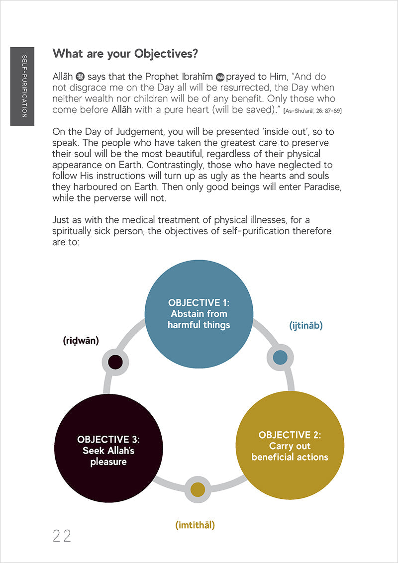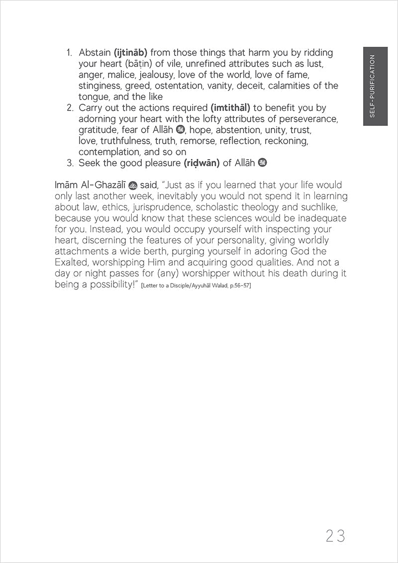 This spiritual guide to the self is a handbook of tazkiyah or 'self-purification'. Not only does it illustrate the maladies of the human spiritual condition, it recognizes the struggles and insecurities we all succumb to from time to time, and offers up the remedies too. The antidotes to our ailments are drawn from Qur'anic verses and authenticate ahadith (Prophetic sayings), inspiring mindfulness of the Almighty Cherisher (SWT) and His Beloved Prophet (PBUH). This guidebook, drawing on the 11th and 12th Century works of the 'Proof of Islam' and the wondrous sage, Imam Abu Hamid Al-Ghazali can be applied to our busy lives in the modern, hi-tech era, and will prove accessible to people of all ages, all denominations: believers and non-believers alike.