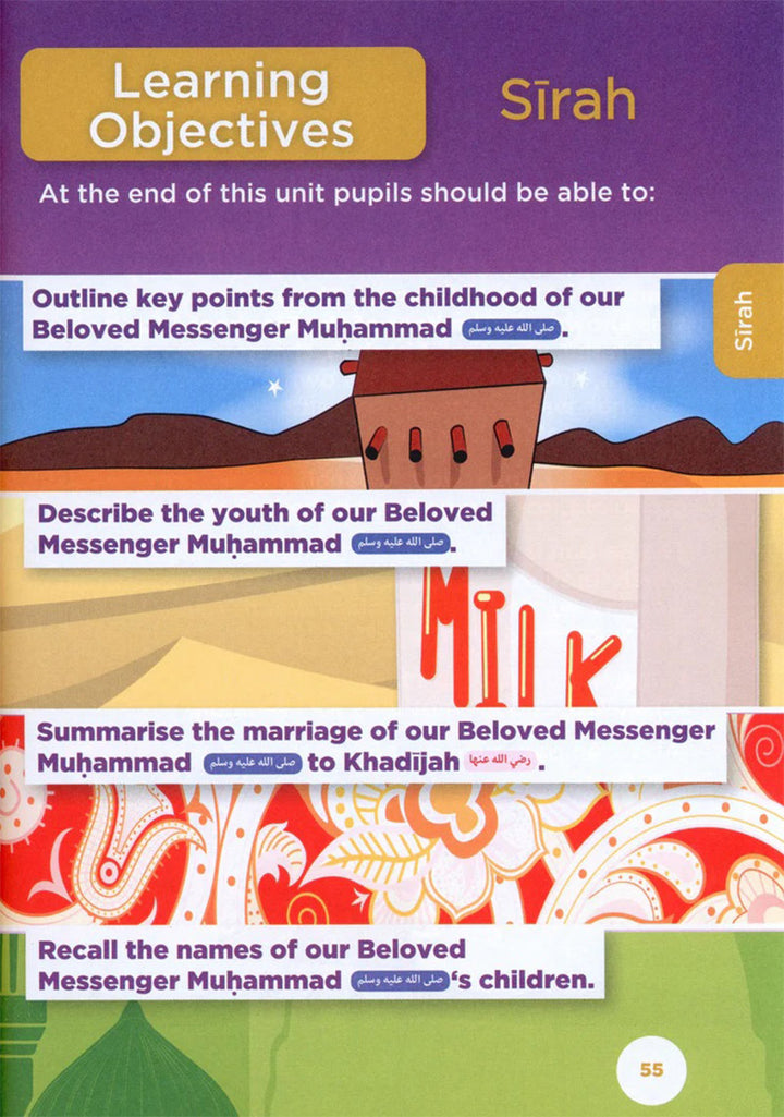Our Beloved Messenger Muhammad’s (saw) childhood youth.The stories of Adam (as) and Nuh (as), the articles of Faith, the importance of respect and the etiquettes of eating, drinking and sleeping.