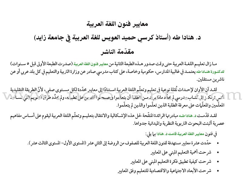 This book consists of three chapters. The first chapter talks about the standards in general; the second chapter explains the standards in detail—the standards of Arabic language arts which were written by Dr. Hanada Taha. The third chapter includes learning objectives for each grade level. Each learning objective includes an appendix for visual words, evaluation standards, and grammar, morphology, and dictational concepts according to Dr. Hanada Taha’s standards.