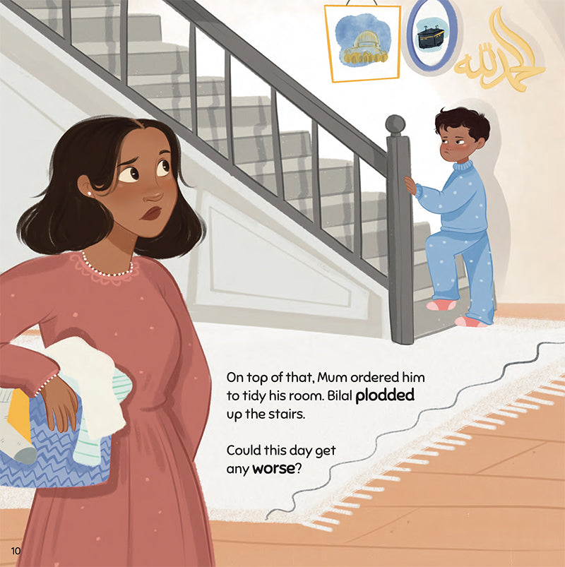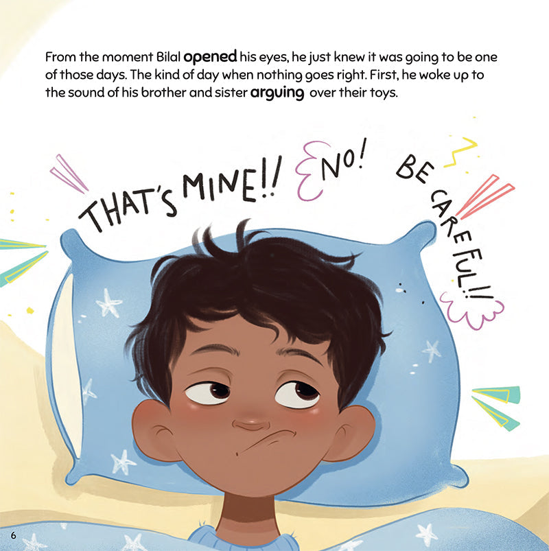 Bilal’s Bad Day is a charmingly colored, interactive book that aims to show young Muslim minds how to draw upon the remembrance of Allah (SWT) and take practical steps to help themselves when their big emotions are threatening to take over.