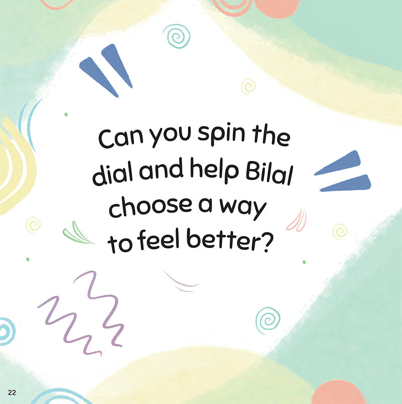 Spin the dial and help Bilal choose a calming strategy to change chaos back to calm. Next time you read and spin, you might land on a different way to feel better.
