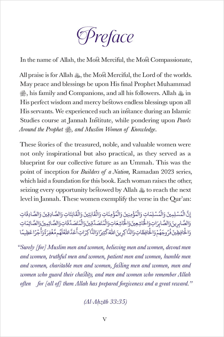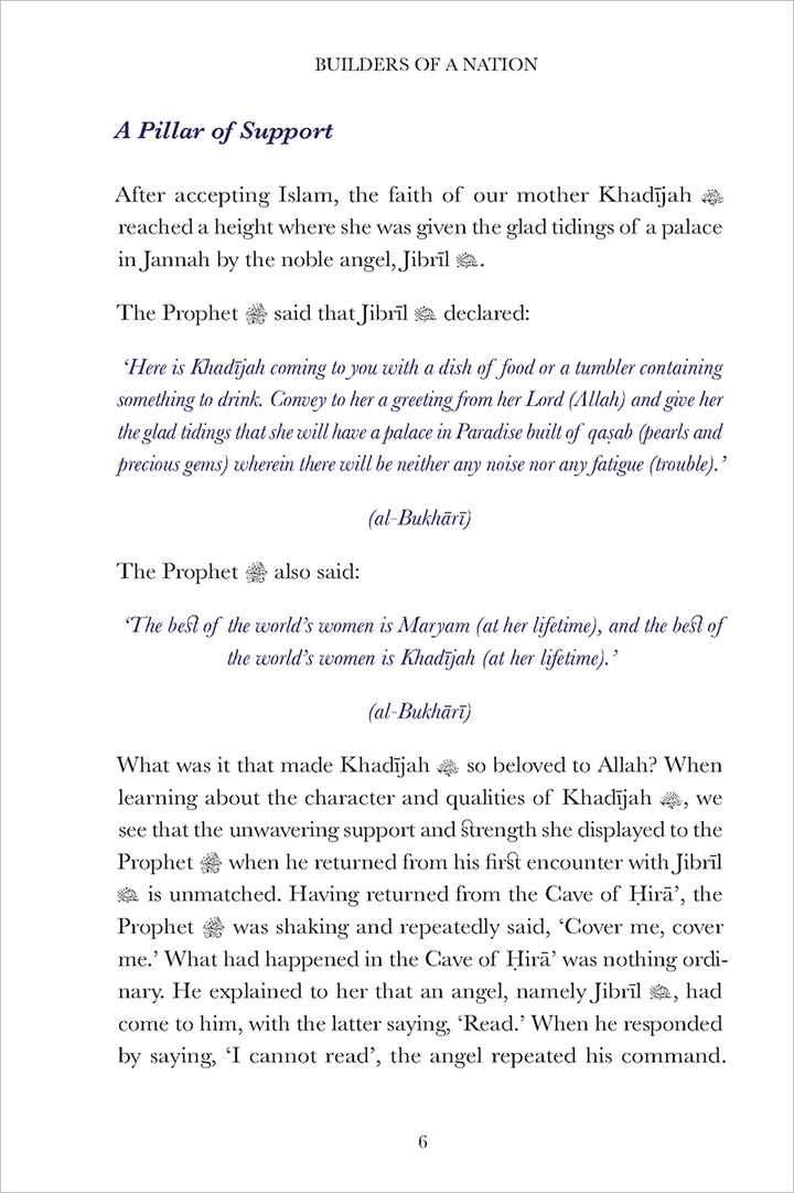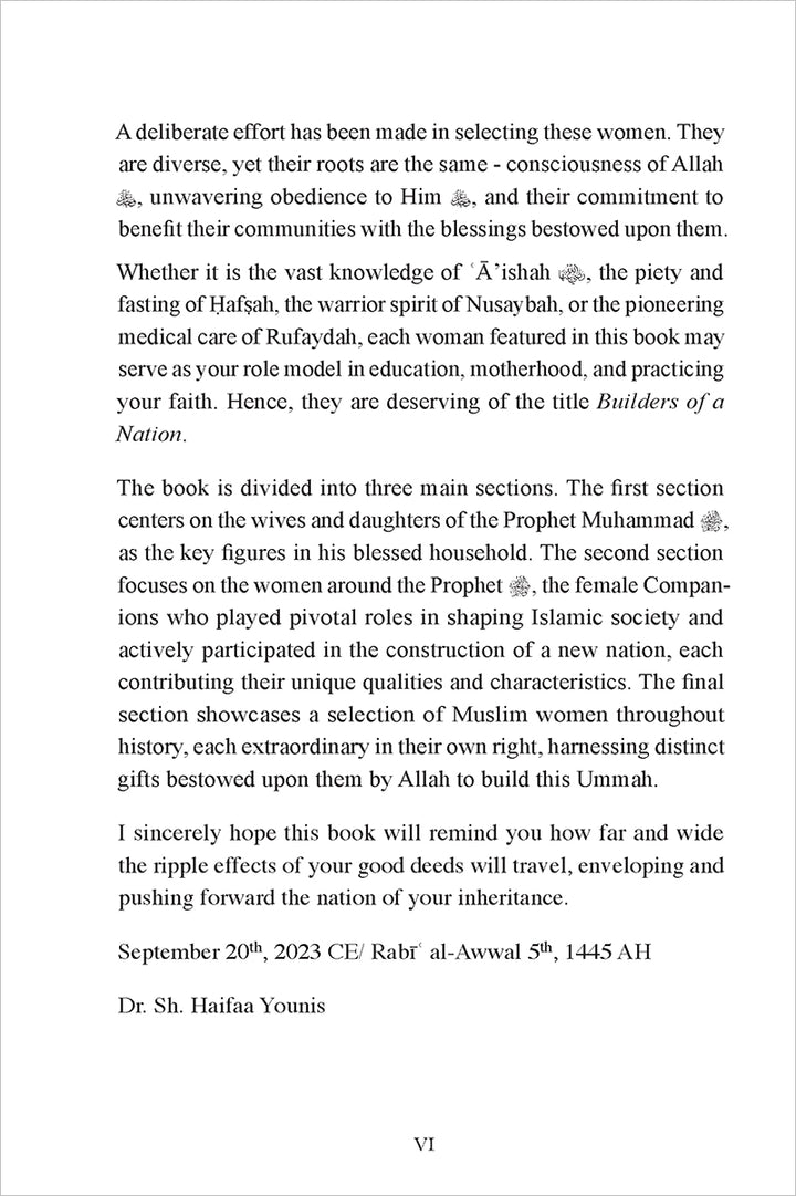 Whether it is the vast knowledge of ʿĀ’ishah, the piety and fasting of Ḥafṣah, the warrior spirit of Nusaybah, or the pioneering medical care of Rufaydah, each woman featured in this book can serve as a role model in education, motherhood, and practicing faith. They are truly deserving of the title Builders of a Nation.