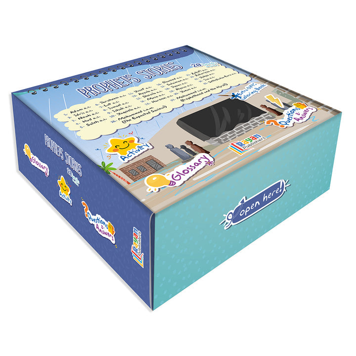 This box set includes the following books: Prophet Adam (a.s.), Prophet Idris (a.s.), Prophet Noah (a.s.), Prophet Hud (a.s.), Prophet Saleh (a.s.), Prophet Ibrahim (a.s.), Prophet Lut (a.s.), Prophet Ismail (a.s.), Prophet Ishaq (a.s.), Prophet Yaqub (a.s.), Prophet Yusuf (a.s.), Prophet Ayyub (a.s.), Prophet Shuaib (a.s.), Prophet Musa (a.s.), Prophet Harun (a.s.), Prophet Dawud (a.s.), Prophet Sulayman (a.s.), Prophet Ilyas (a.s.), Prophet Yunus (a.s.), Prophet Dhul-Kifl (a.s.), Prophet Zakariya (a.s.), Prophet Yahya (a.s.), Prophet Isa (a.s.), Prophet Seth, Prophet Yusha, Prophet Ezra (a.s.), Prophet Muhammad (s.a.w.), The Expected Savior, Prophethood and Hijrah, and a coloring book.