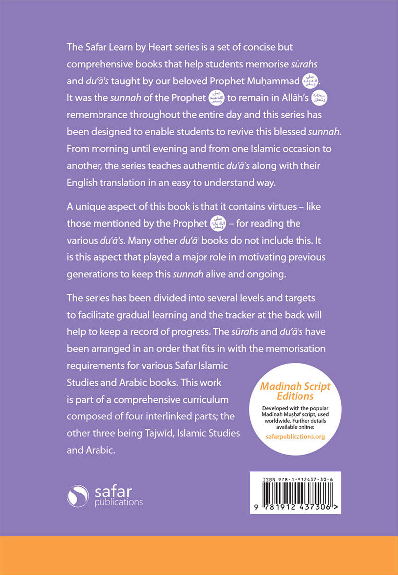 The series has been divided into several levels and targets of facilitate gradual learning and the tracker at the back will help to keep a record of progress. The surahs and duʿaʾs have been arranged in an order that fits in with the memorisation requirements for various Safar Islamic Studies and Arabic books. This work is part of a comprehensive curriculum.