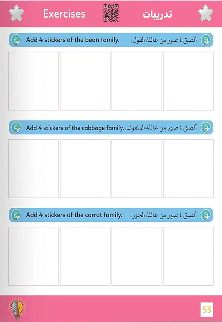 - تتميز الصفحات الملونة بصور للأطعمة للنظر إليها وأسمائها للقراءة، ويصبح التعلم تفاعليًا عندما يجد الأطفال ويطابقون الملصقات الصحيحة مع الأماكن الصحيحة.