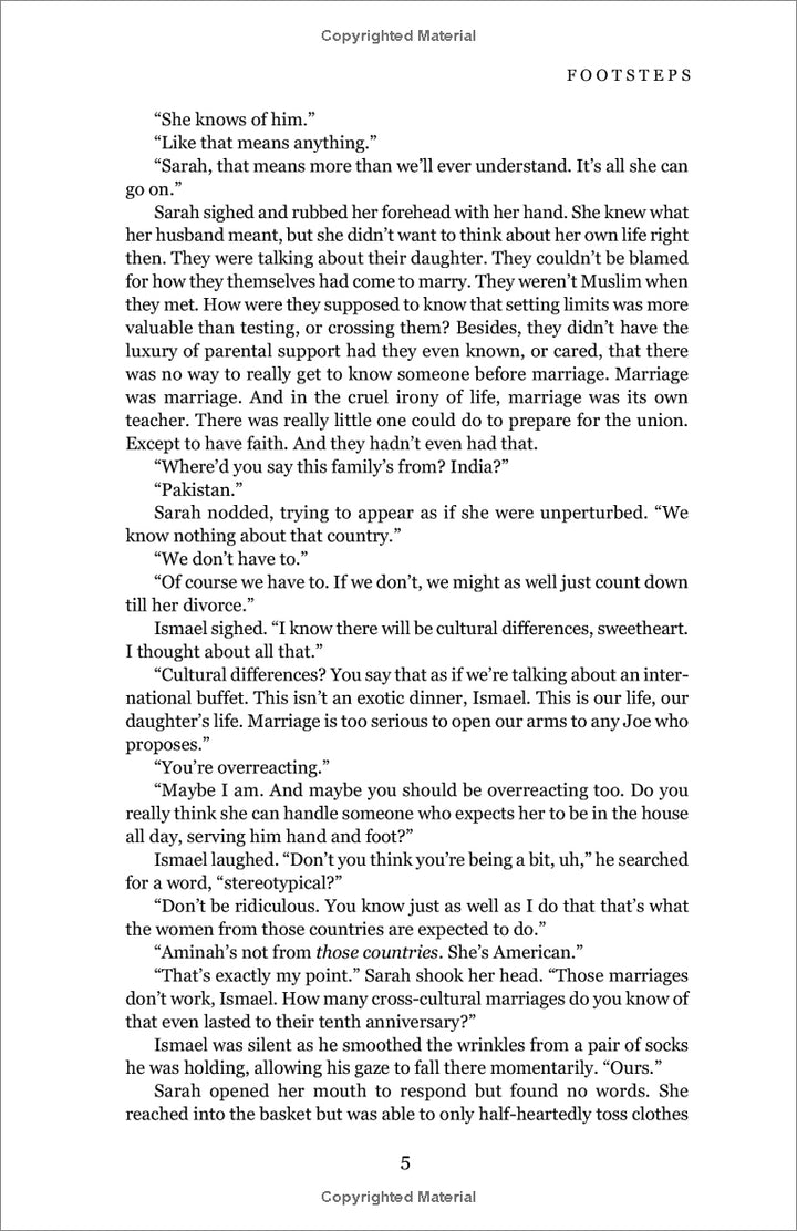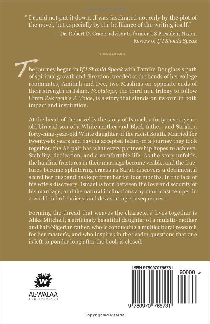 The journey began in If I Should Speak with Tamika Douglass's path of spiritual growth and direction, treaded at the hands of her college roommates, Aminah and Dee, two Muslims on opposite ends of their strength in Islam. Footsteps, the third in a trilogy to follow Umm Zakiyyah's A Voice, is a story that stands on its own in both impact and inspiration.
