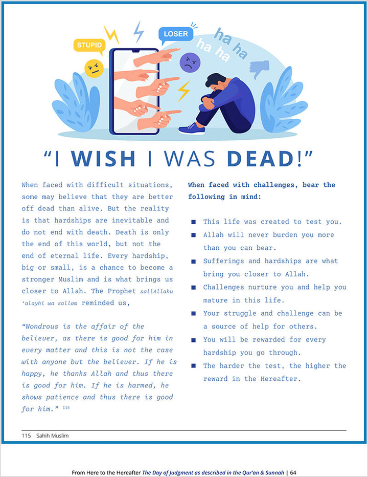 Have you ever heard someone say, "I wish I was dead?" From Here to Hereafter explores the soul's journey from this temporary world into the eternal Hereafter. It describes life after death, with vivid scenes from the Qur'an and Sunnah depicting what happens when a person is dying, what occurs after death as they enter the Hereafter, and the major and minor signs of the onset of the Day of Judgment. What shocking events will characterize this day? How will the terrifying reckoning transpire? Where will we end up: heaven or hell? What will the final abode look like?