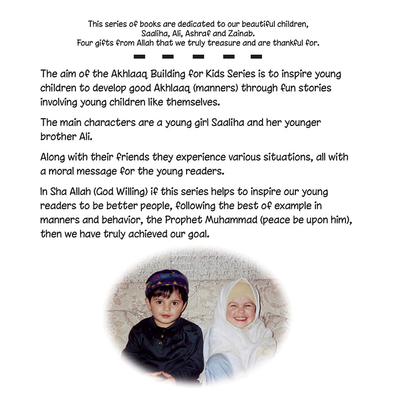This is the latest title in the Akhlaaq Building Series. It teaches children all about carrying out any amanah given to them. When Saaliha's friend Nora asks her to deliver something, Saaliha knows the importance of fulfilling her trust.