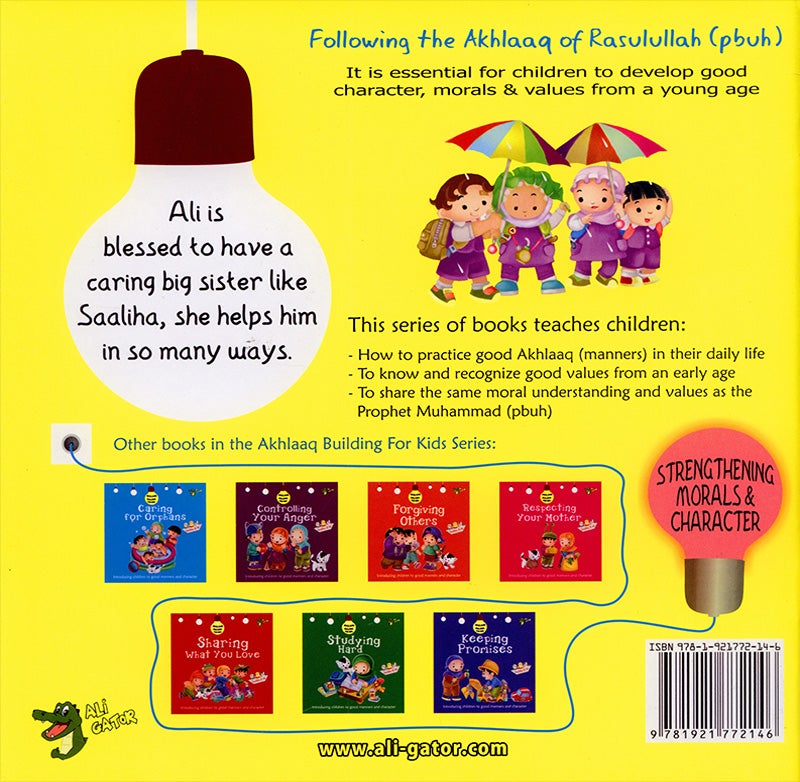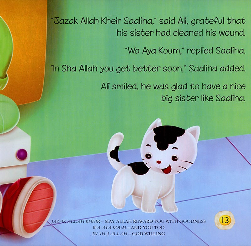 Ali, like most young boys, likes to run around, but sometimes he falls over and hurts himself. Lucky for Ali, he has a caring big sister Saaliha who helps him in so many ways. Encourages young children to follow the good manners of Prophet Muhammad.
