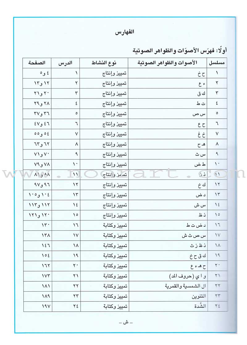- التركيز على الاحرف المتماثلة و القراءة و الاستيعاب و تمارين الكتابة الابداعية و الامر و الترقيم و تعبئة الاحرف الناقصة و المطابقة و الوقت و النوع.