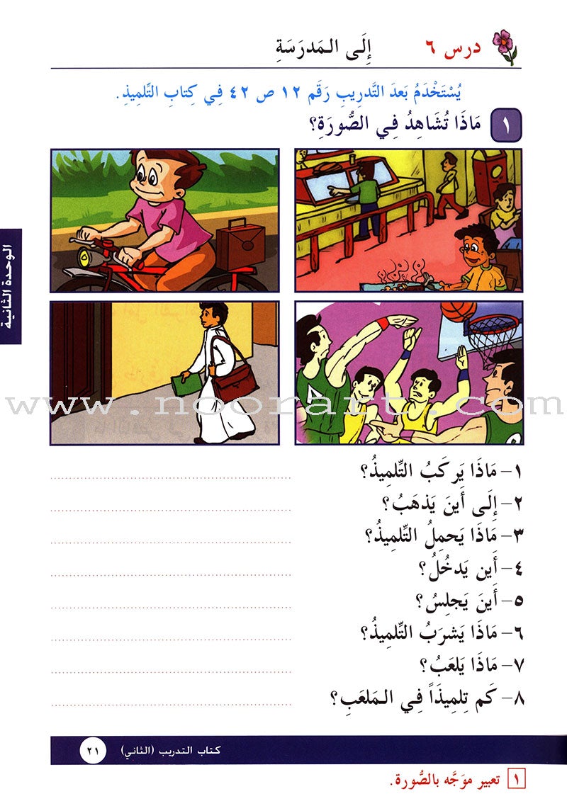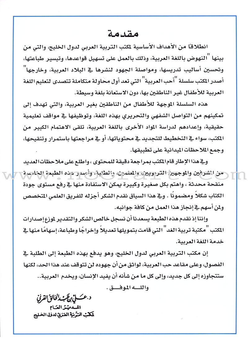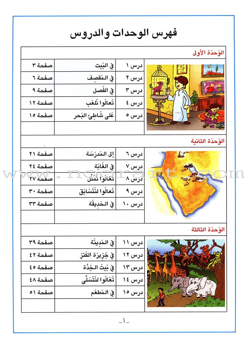 The series displays the vocal system of the Arabic language in its different phenomena. It presents vocabularies that are common in an Arabic dictionary for children. It also features 4,300 words and it concentrates on pictorial concrete vocabulary in the first two books. The series provides the student with a number of basic linguistic structures (about 500 structures). Each lesson contains a specific number of structures and expressions. The lessons gradually advance and each principle is revisited from one lesson to the next. It also includes the entirety of the Arabic syntax rules in the levels (fifth- twelfth) and combines application with practical training based upon theoretical rule.