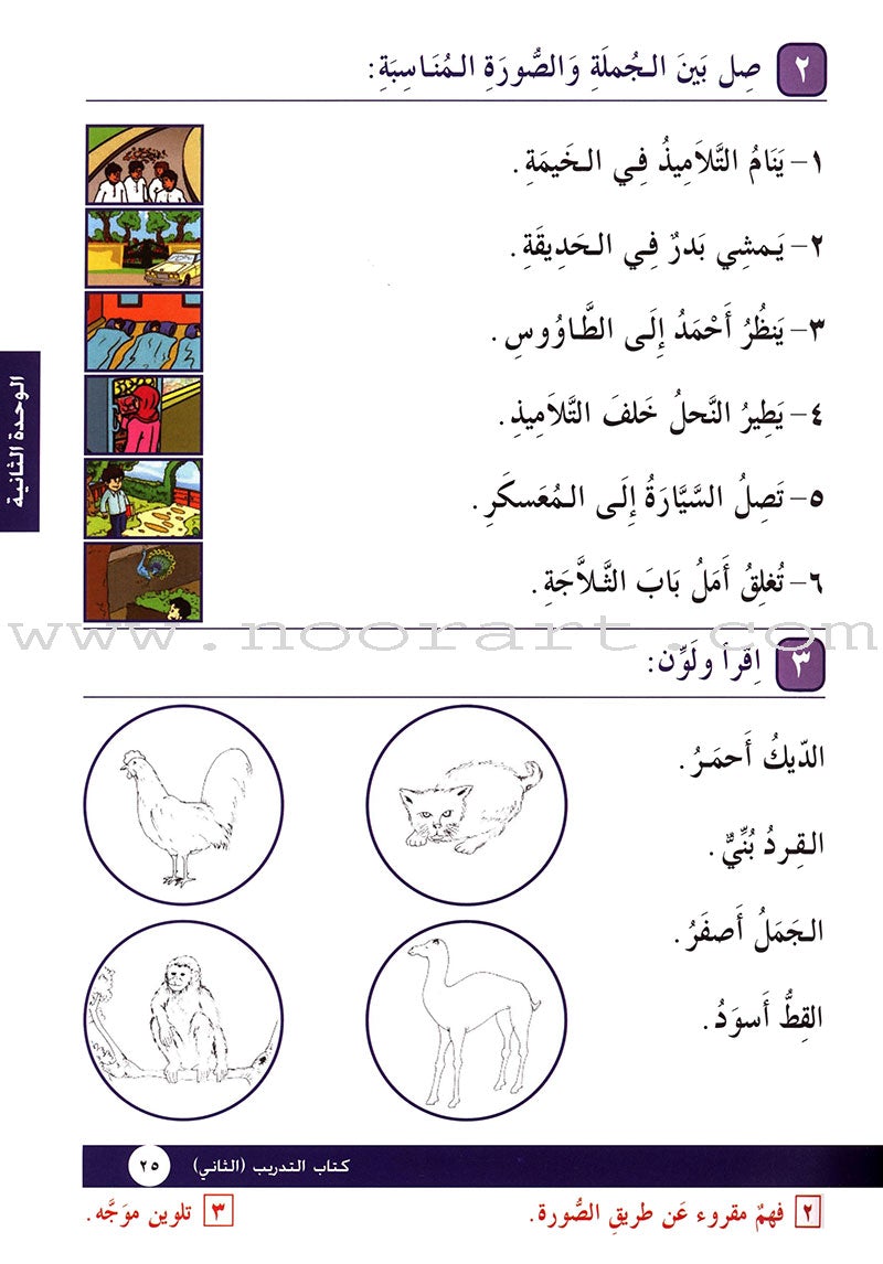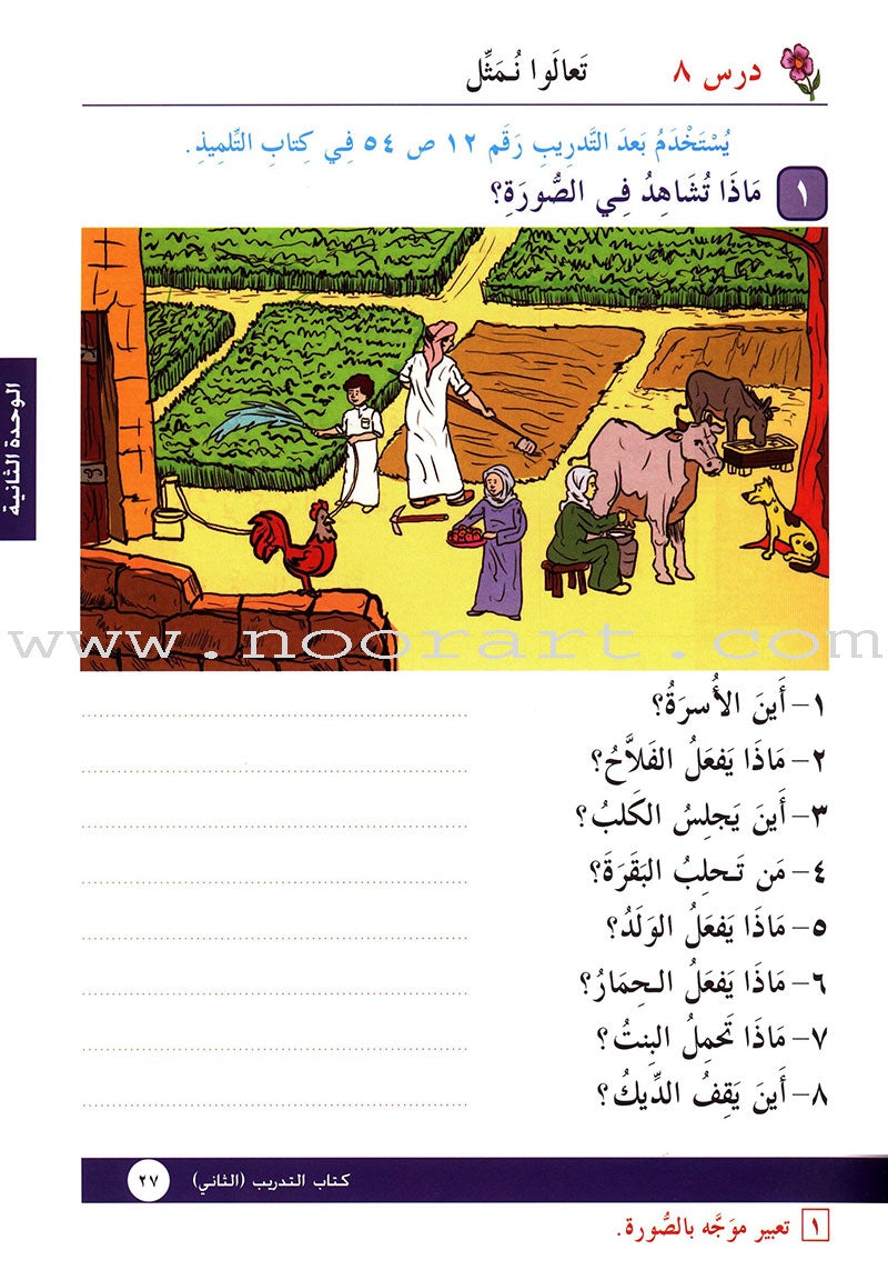 تعد مادة كتاب التدريبات الثاني امتدادًا لكتاب التلميذ الثاني وتعميقا لها وتعزيزًا لما اكتسبه الطالب من مهارات وعناصر لغوية، فكل درس من دروس كتاب التلميذ الخمسة والعشرين، يقابله في كتاب التدريبات ثلاث صفحات يؤديها التلميذ في الفصل بمعاونة المعلم، وإذا لم يتمكن التلميذ من الانتهاء من الصفحات الثلاث في الحصة، يمكن أن يكلف بأداء ما تبقى في المنزل، ثم يجمع المعلم الكتب من التلاميذ بعد كل درس لتصحيحها.