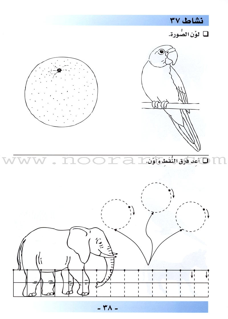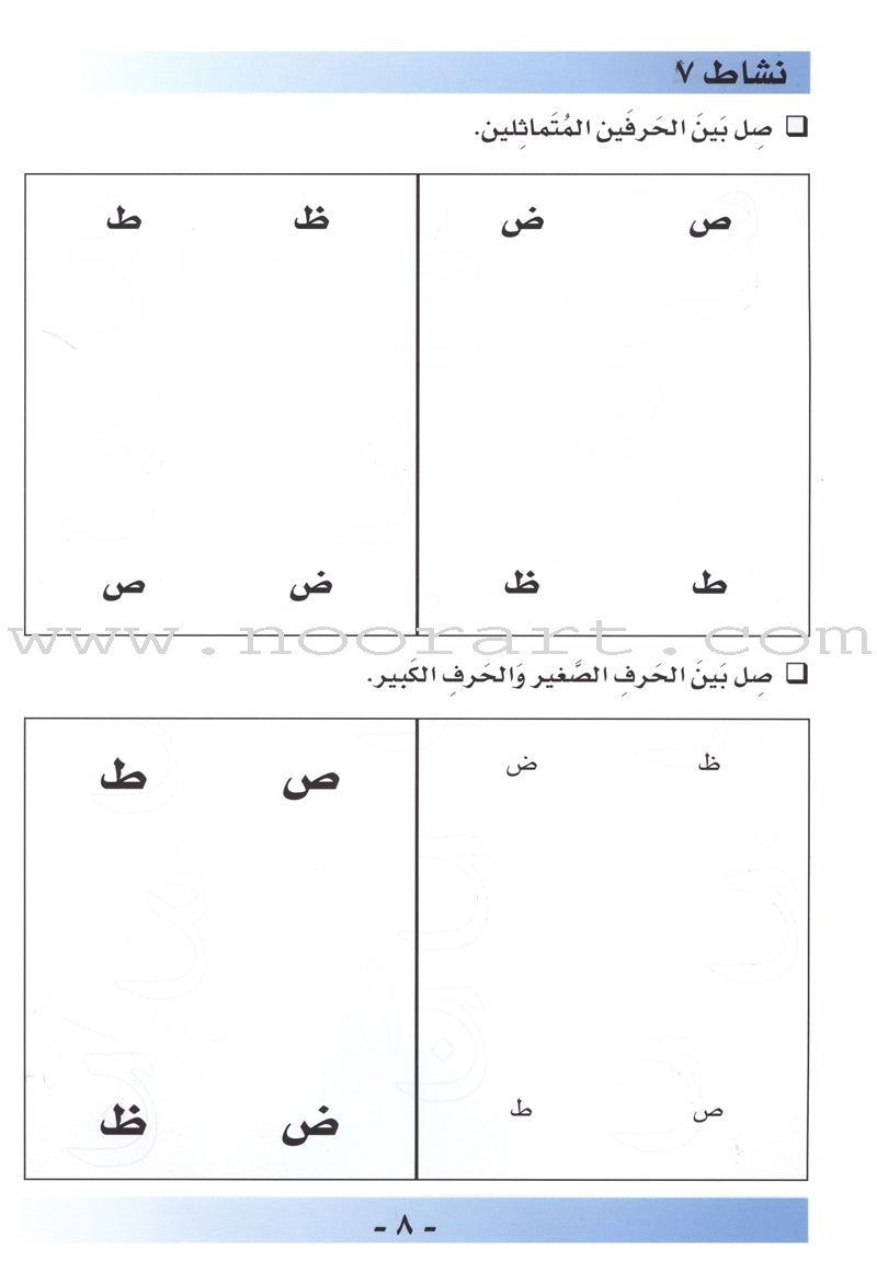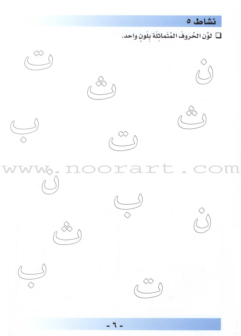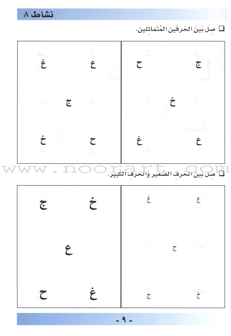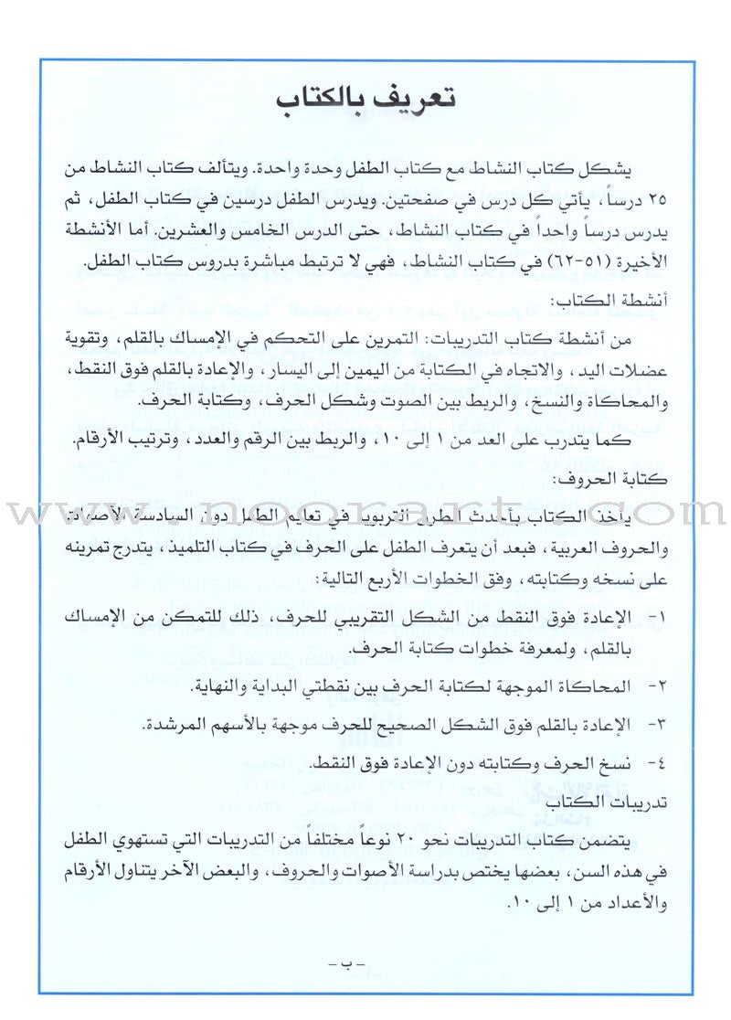 من أنشطة كتاب التدريبات : التمرين على التحكم في الإمساك بالقلم , وتقوية عضلات اليد , والاتجاه في الكتابة من اليمين إلى اليسار, والإعادة بالقلم فوق النقط , والمحاكاة والنسخ , والربط بين الصوت وشكل الحرف , وكتابة الحرف.