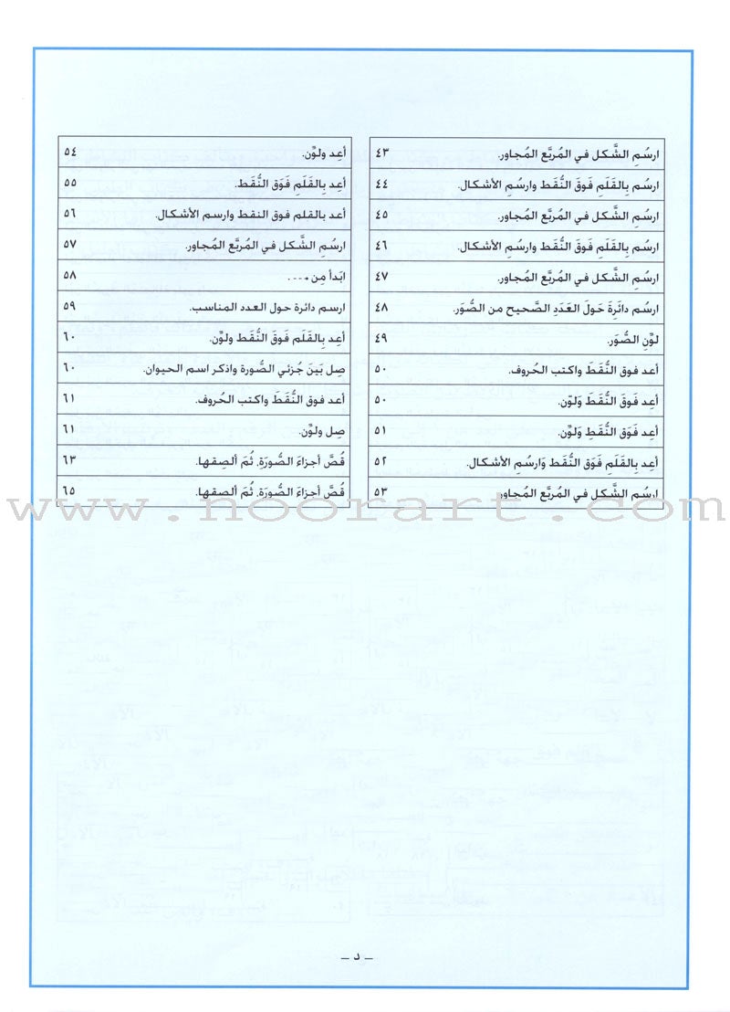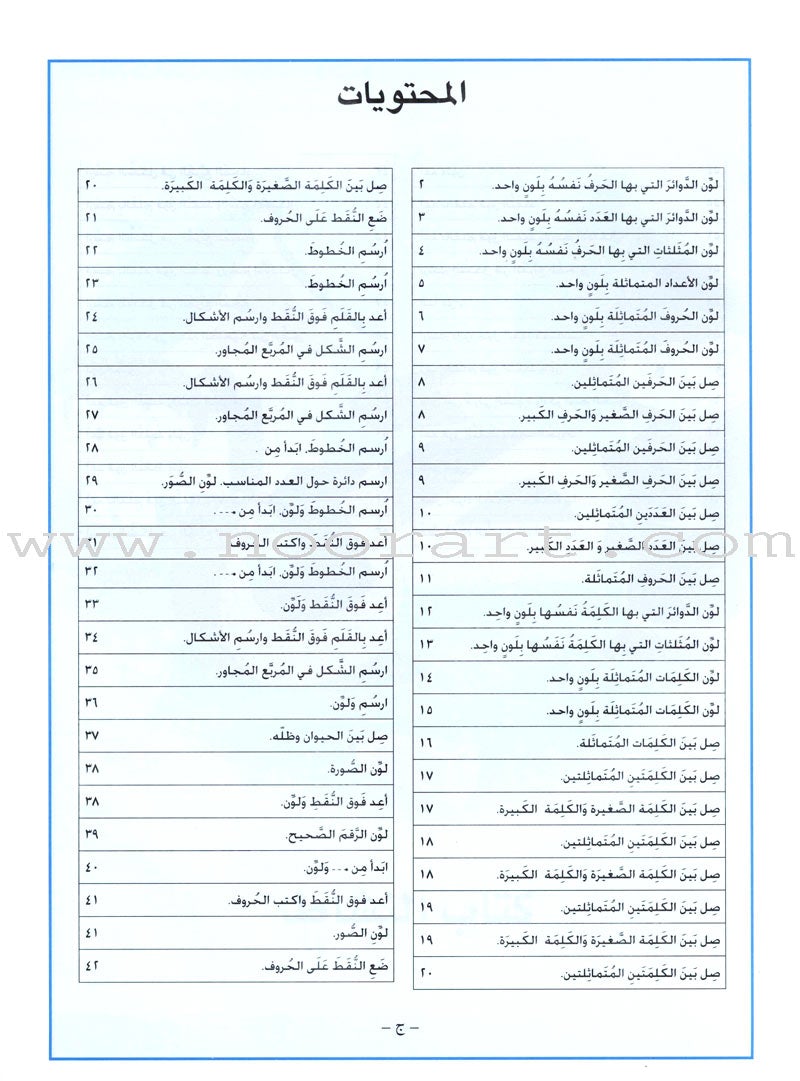 يتضمن كتاب التدريبات نحو 20 نوعاً مختلفاً من التدريبات التي تستهوي الطفل في هذه السن , بعضها يختص بدراسة الأصوات والحروف , والبعض الآخر يتناول الأرقام والأعداد من 1 إلى 10 .