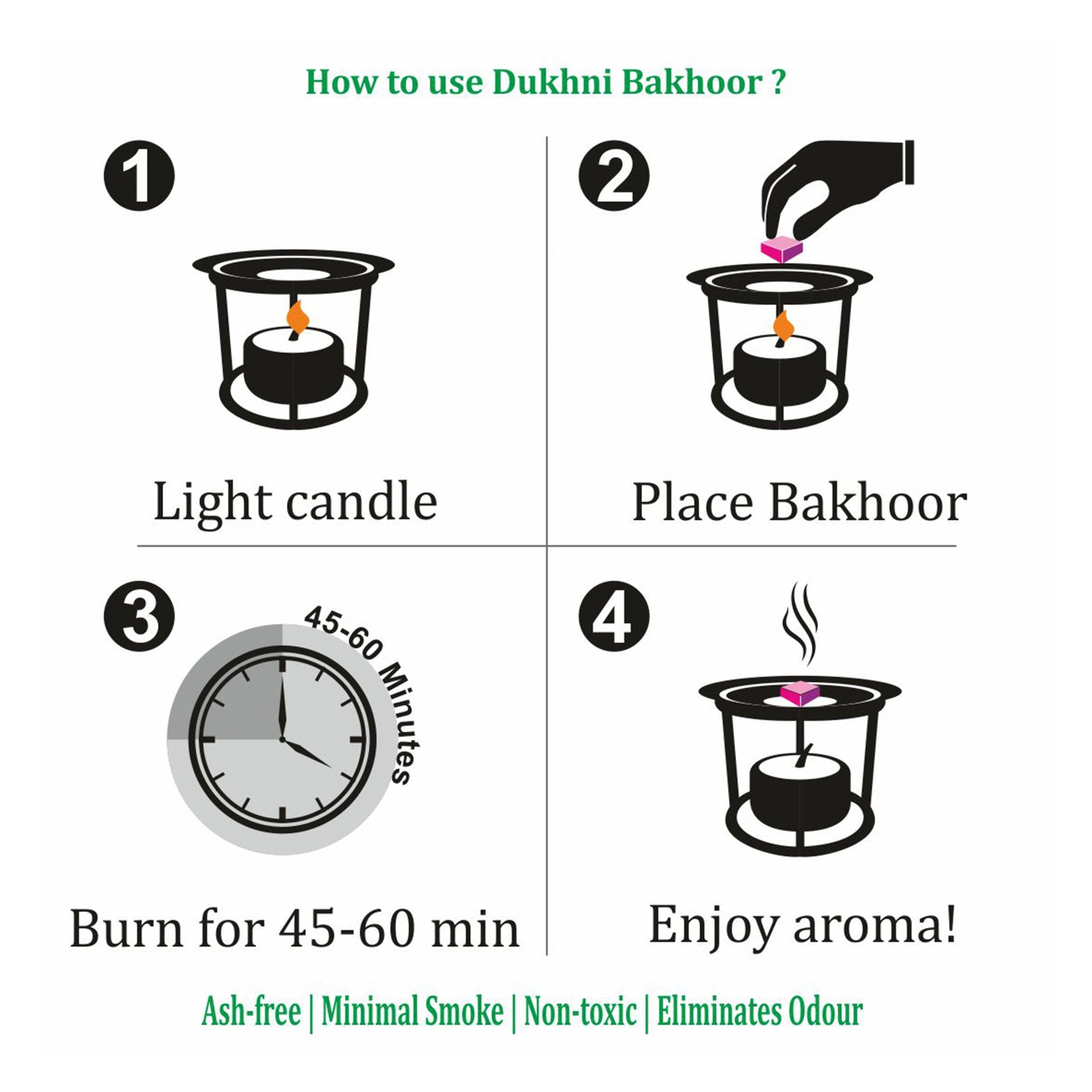 <Dukhni Bakhoor is made from a traditional recipe using sustainably sourced natural ingredients for their aromatic properties. Each fragrance is derived from various combinations of aromatic extracts, botanical extracts, essential oils, spices, resins, and woods