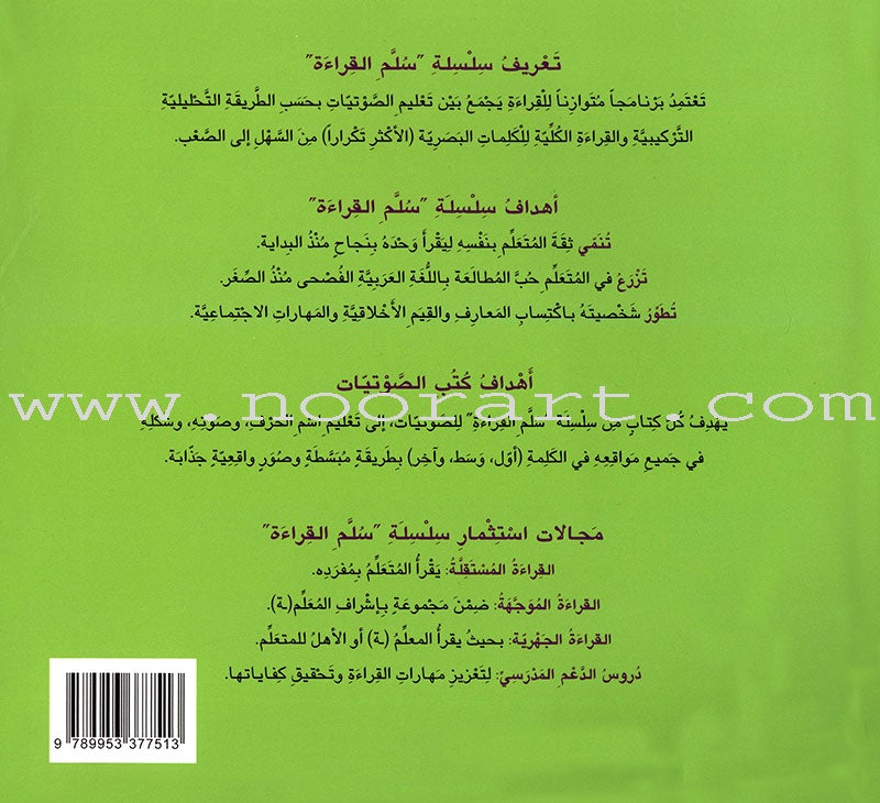 يهدف كل كتاب من سلسلة "سلم القراءة" للصوتيات إلى تعليم اسم الحرف وصوته وشكله في جميع مواقعه في الكلمة (أول، وسط، وآخر) بطريقة مبسطة وصور واقعية جذابة.