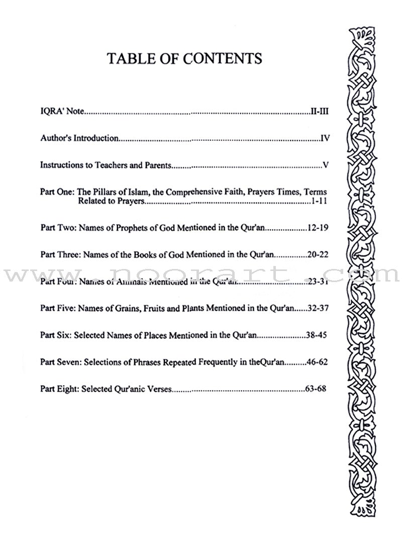 In this exercise book, plenty of practice in reading and writing frequently used Qur’anic Arabic terms, phrases and expressions are used in over 60 lessons that are designed to teach the writing of Arabic words and sentences. Meanings are also provided so that students will appreciate the message of the words that they are reading. Notes and instructions for the teacher are provided also in each book. The material is presented and organized under eight categories of reference that can serve as a little dictionary of some Qur'anic themes. All of the words which are introduced in this activity book are of high frequency in the Qur’an. Some of them, in variation form, occur as many as one hundred times or more.