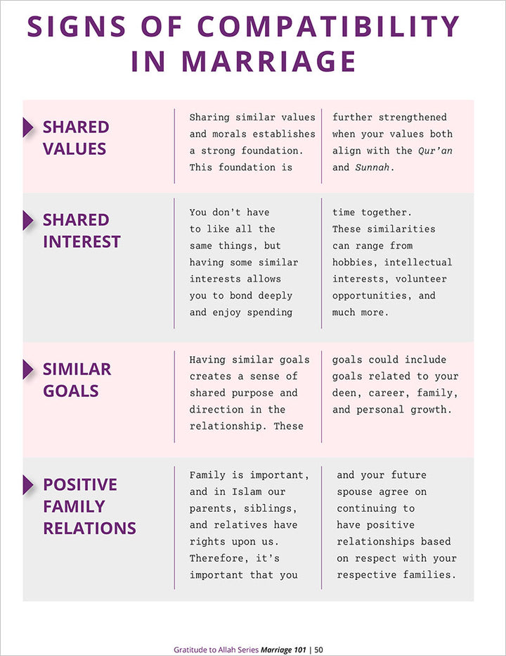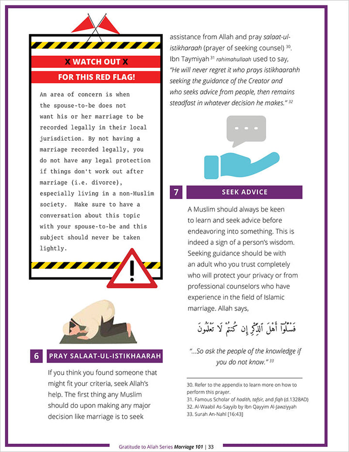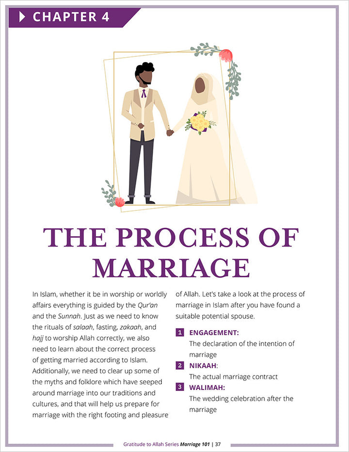 This book contains colorful images, activities, and scenarios designed for readers to learn about and navigate through the beginning, middle, and sometimes unfortunate end of marriage with an Allah-centric approach. Topics include understanding why one should get married, aspects to consider when selecting a spouse (deen, wealth, etc.), how to go through the marriage process, as well as tips on how to create and maintain a healthy and loving marriage. It is a must read for all Muslims, single, married, or divorced!