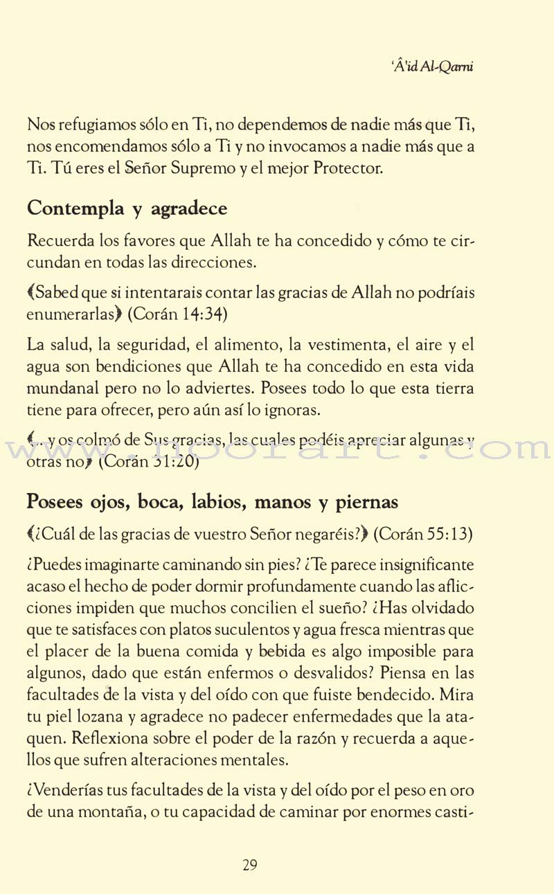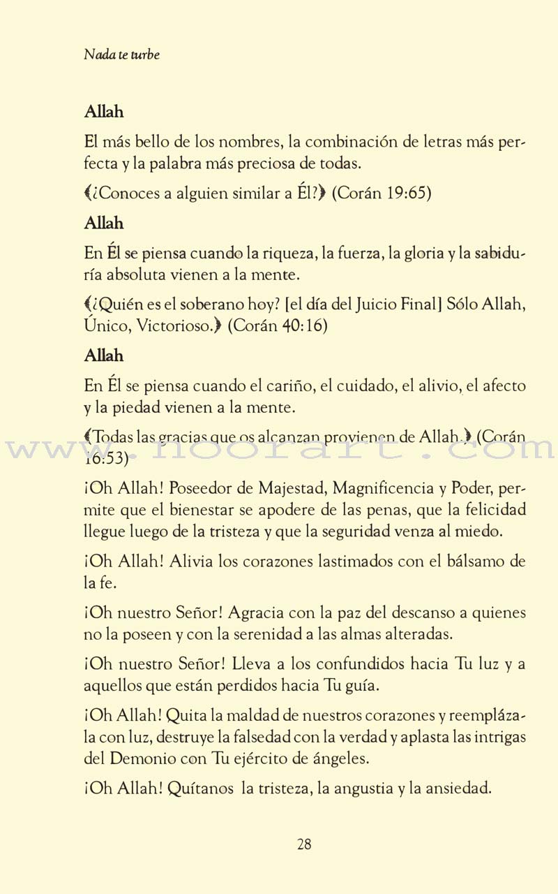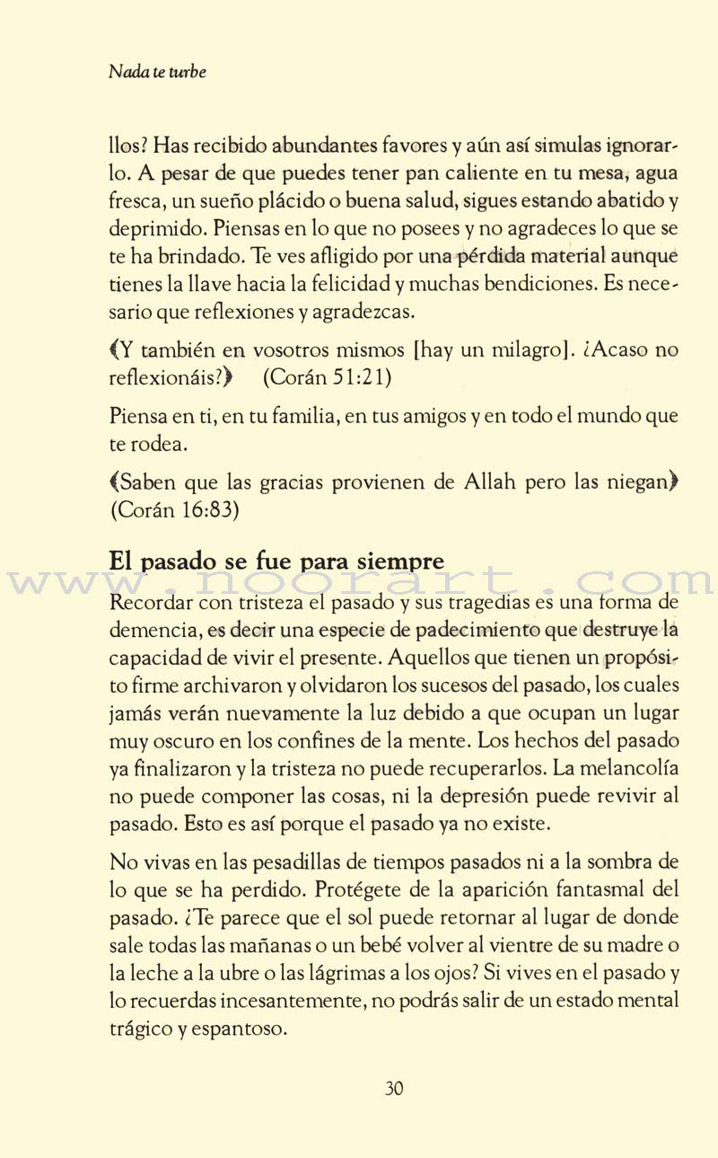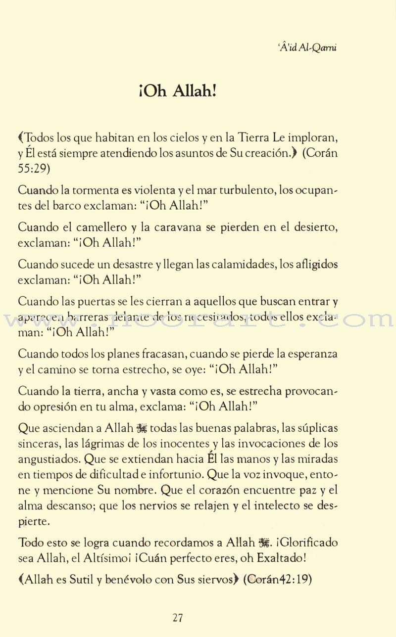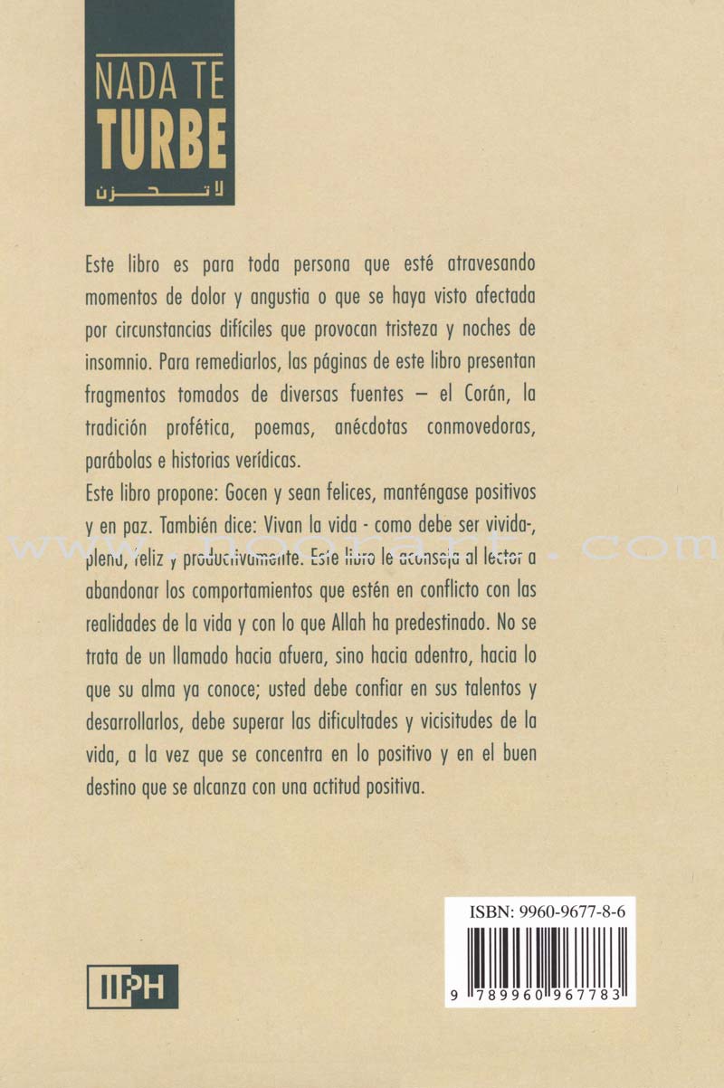 Este libro es para toda persona que esté atravesando momentos de dolor y angustia o que se haya visto afectada por circunstancias difíciles que provocan tristeza y noches de insomnio. Para remediarlos, las páginas de este libro presentan fragmentos tomados de diversas fuentas - el Corán, la tradición profética, poemas, anécdotas conmovedoras, parábolas e historias verídicas. Este libro propone: gocen y sean felices, manténgasen positivos y en paz. También dice: Vivan la vida - como debe ser vivida -, plena, feliz y productivamente. Este libro le aconseja al lector a abandonar los comportamientos que estén en conflicto con las realidades de la vida y con lo que Allah ha predestinado. No se trata de un llamado hacia afuero, sino hacia adentro, hacia lo que su alma ya conoce; usted debe confiar en sus talentos y desarrollarlos, debe superar las dificultades y vicisitudes de la vida, a la vez que se concentra en lo positivo y en el buen destino que se alcanza con una actitud positiva.