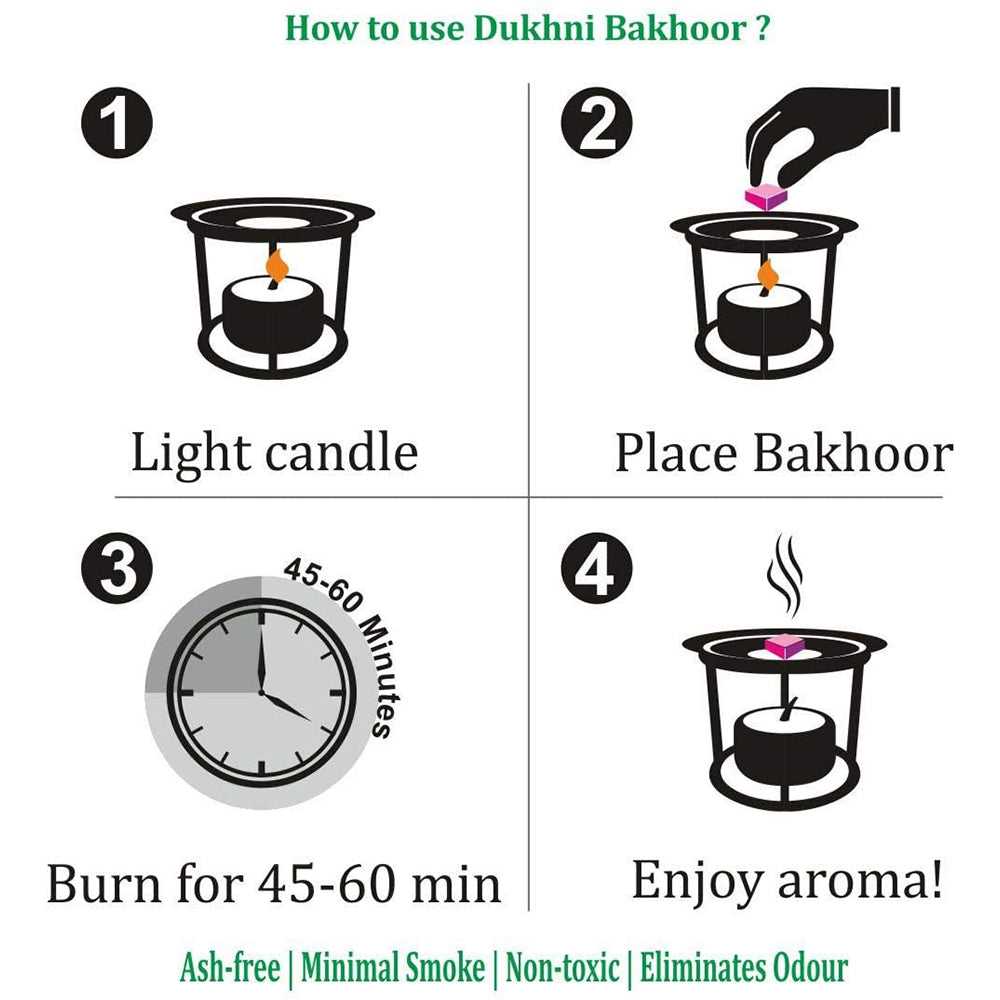We recommend tealight candles with a 3.5 to 4 hour burn time. The beauty of our burner is that it burns without smoke, steadily building up the flavour of the bakhoor and ensuring its longevity. In an unventilated room, the aroma of the bakhoor will spread to about 400 square feet