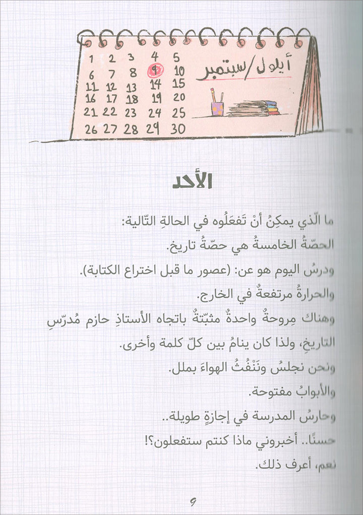 الحصة الخامسة هي حضة تاريخ. ودرس اليوم هو عن( عصور ما قبل اختراع الكتابة). والحرارة مرتفعة في الخارج. وهناك مروحة واحدة مثبتة باتجاه الأستاذ حازم مدرس التاريخ. ونحن نجلس ونَنْفُثُ الهواء بملل. الأبواب مفتوحة، وحارس المدرسة في إجازة طويلة.. حسنًا.. أخبروني ماذا كنتم ستفعلون؟! -