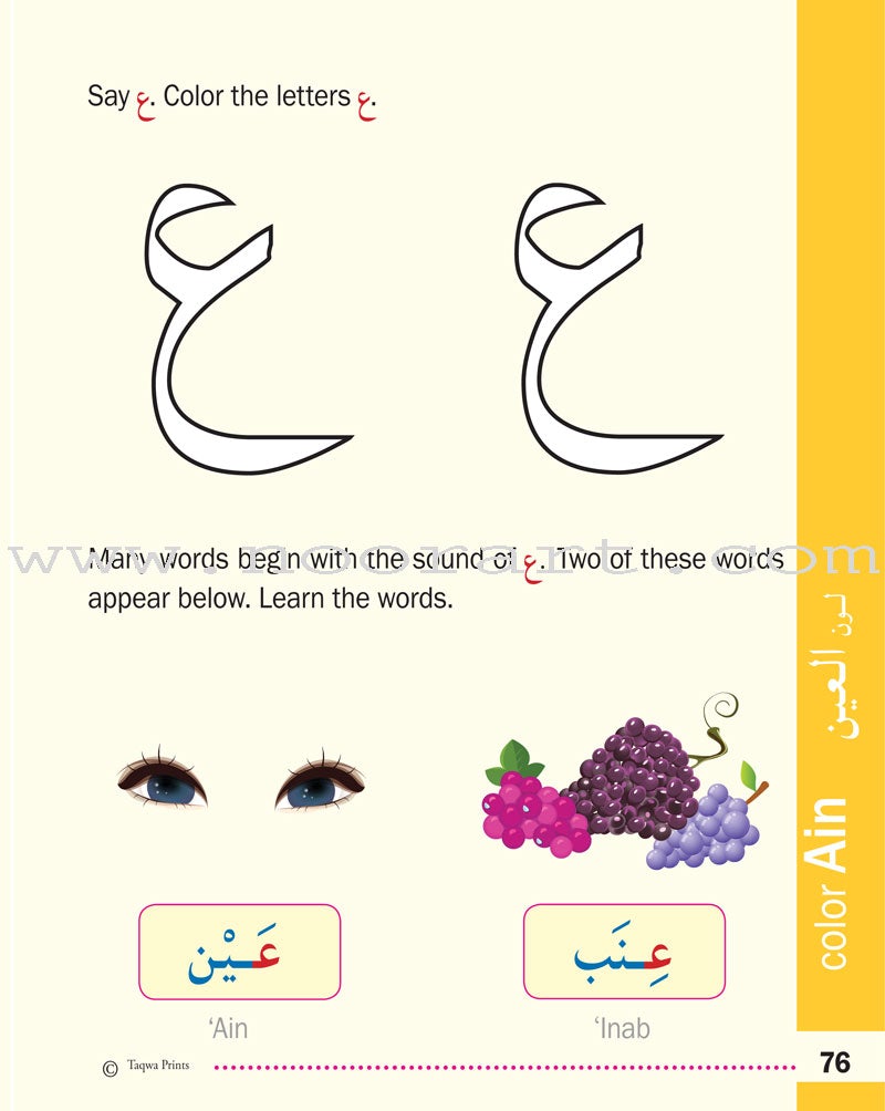 This colorful workbook is designed to introduce Arabic alphabet to kindergarten students. Simple easy-to-follow dotted fonts with arrow indicators are designed to help students learn how to write the letters. Familiar Arabic words associated with the letters are included to jump start learning.