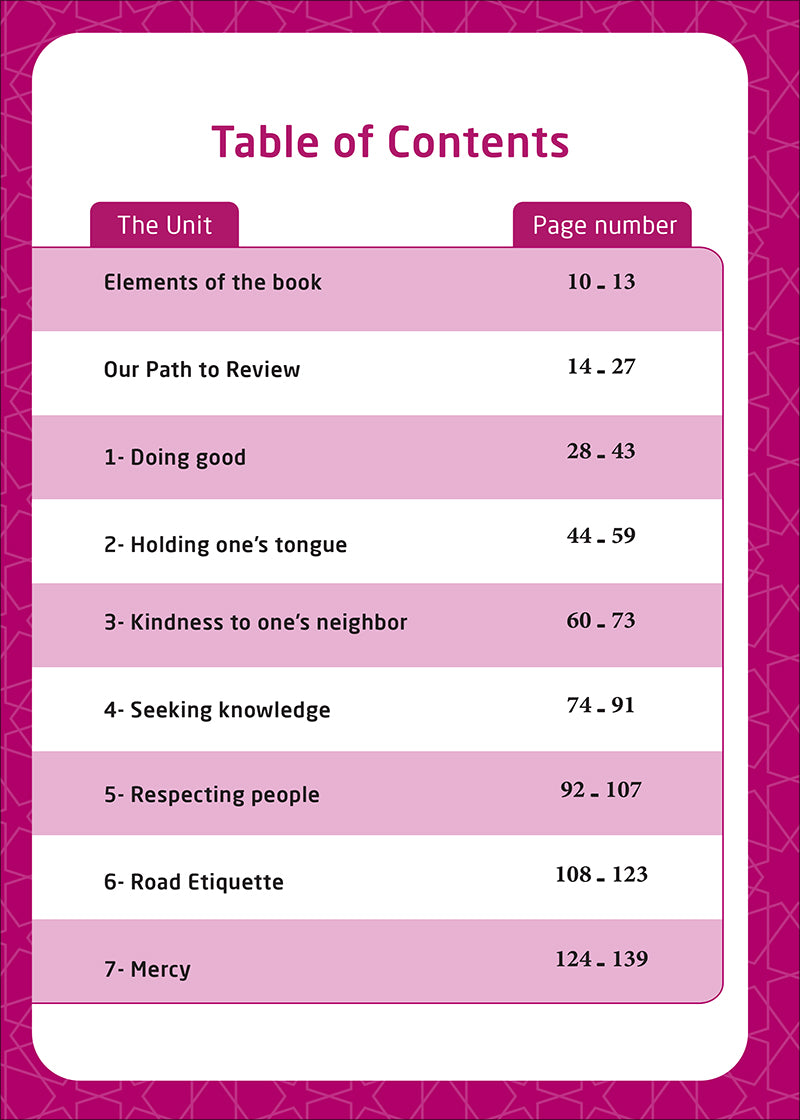 - Islamic Ethics: Topics such as kindness, respect for neighbors, controlling the tongue, seeking knowledge, and road etiquette help shape learners into good Muslims and responsible citizens.