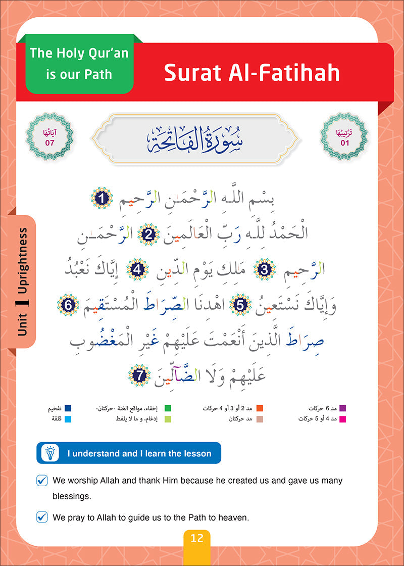 - Qur’an Memorization: Learners are introduced to eight short surahs (Al-Fatihah, An-Nas, Al-Falaq, Al-Ikhlas, Al-Masad, An-Nasr, Al-Kafirun, Al-Kawthar), focusing on their basic meanings and gradual memorization.