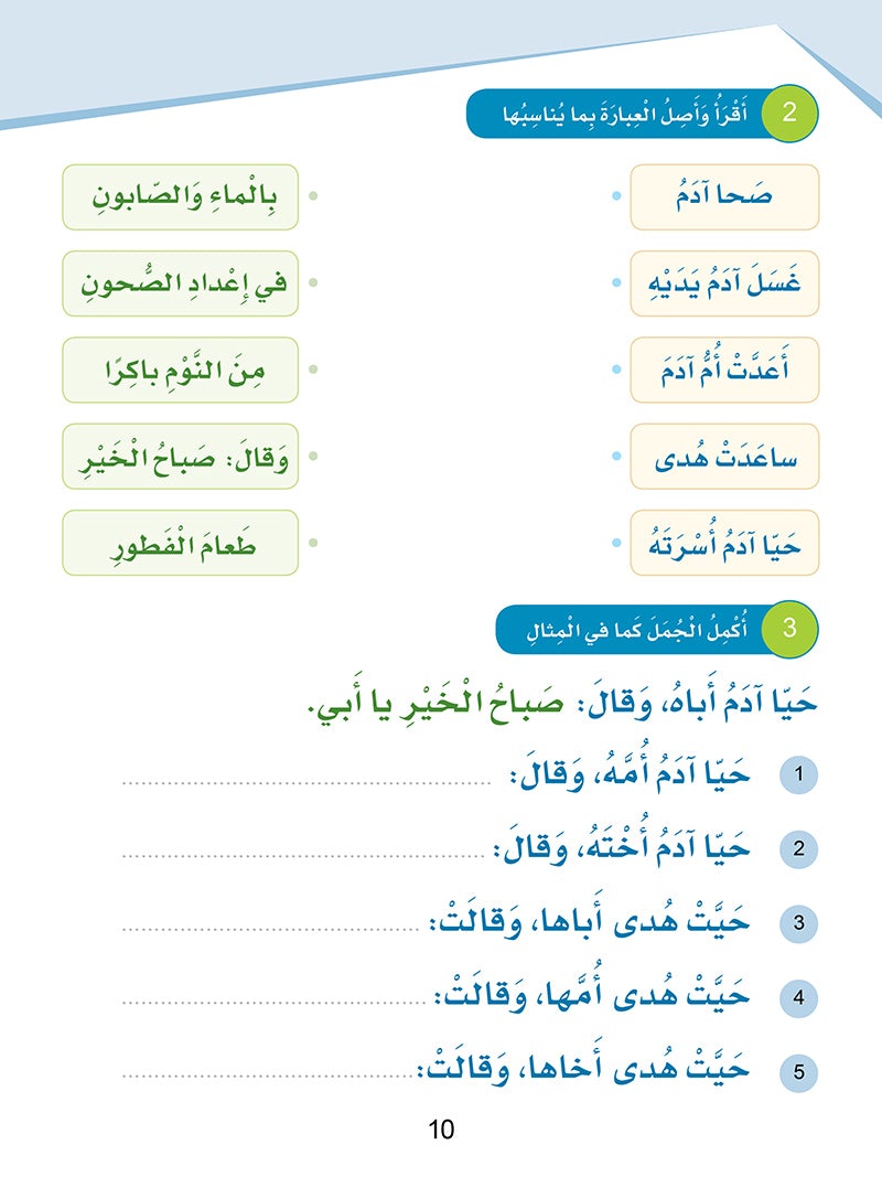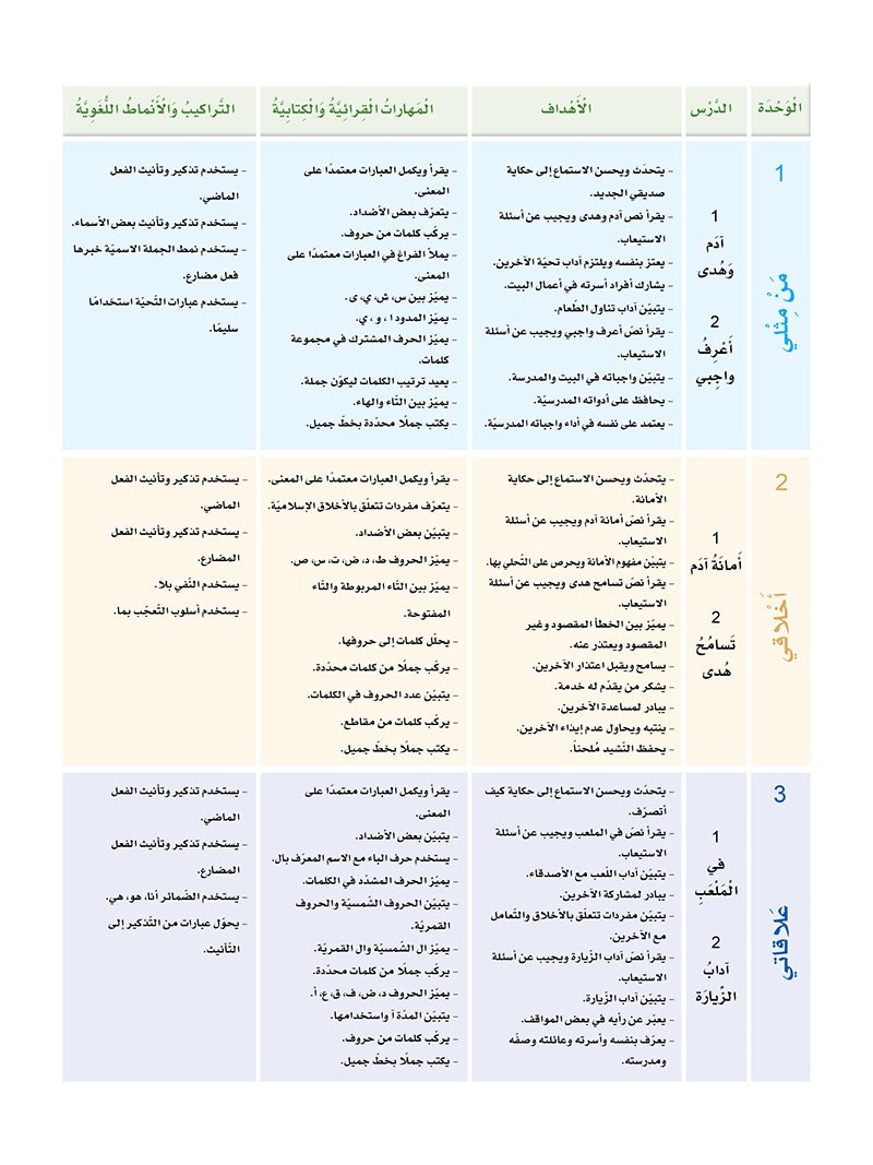 - الوحدة الأولى من مثلي؟ الدرس الأول: آدم وهدى، والثاني: أعرف واجبي.