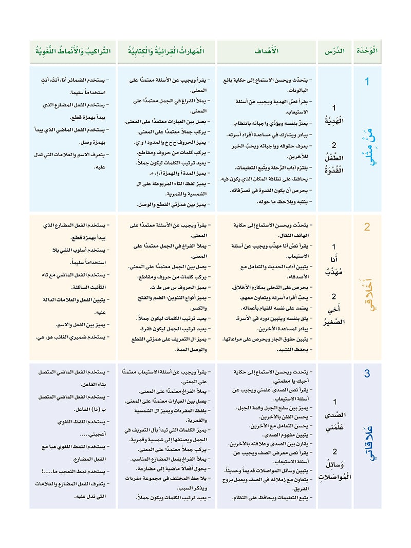 - الوحدة الثالثة علاقاتي، الدرس الأول: الصدى علمني، والثاني: وسائل المواصلات.