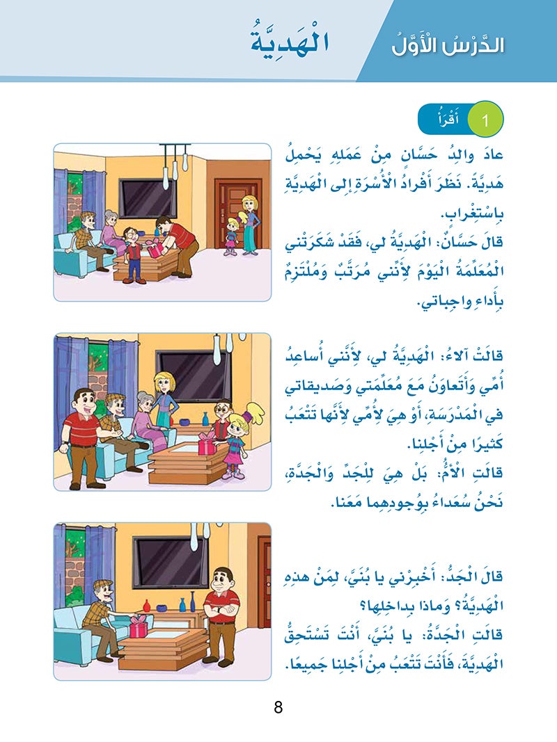 - الوحدة الأولى من مثلي؟ الدرس الأول: الهدية، والثاني: الطفل القدوة.
