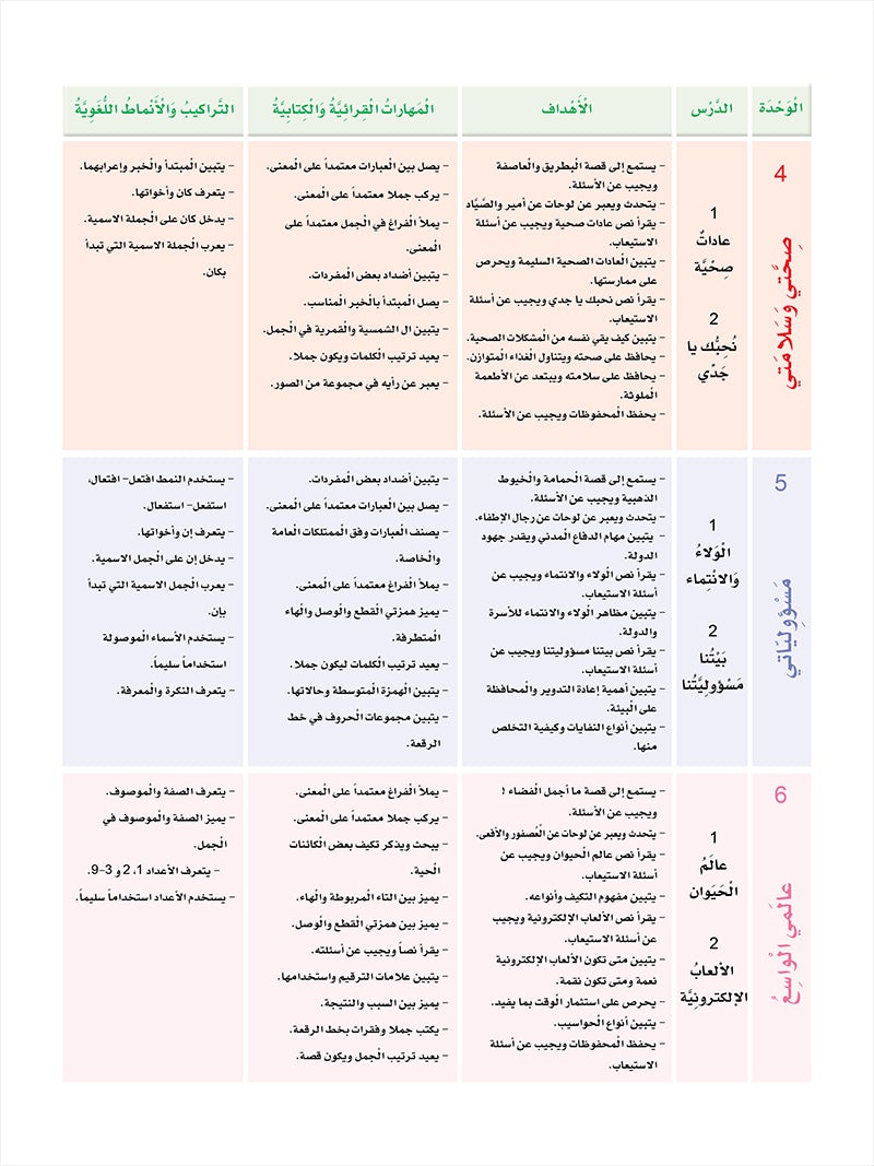 - الوحدة السادسة: عالمي الواسع. الدرس الأول: عالم الحيوان، والثاني: الألعاب الإلكترونية.