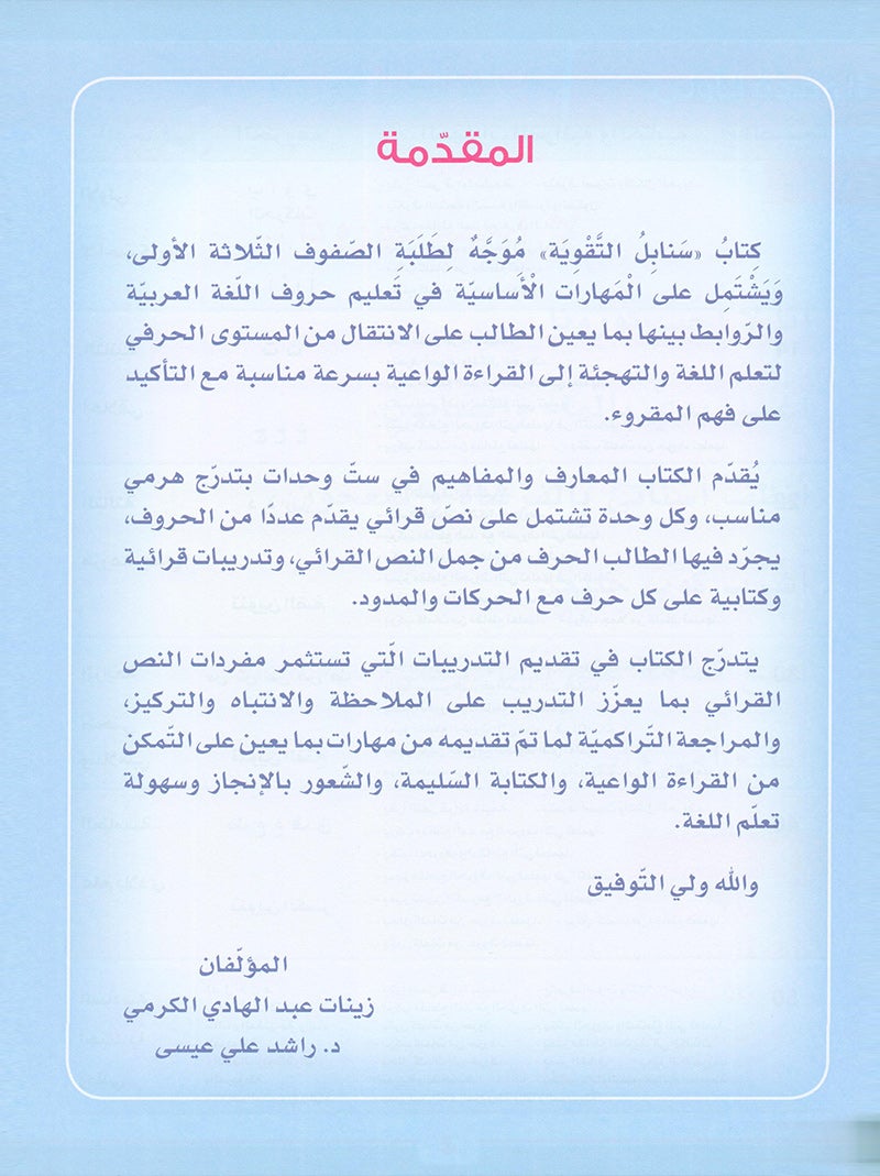 كتاب سنابل التقوية أُعدّ خصّيصًا لتمكين المتعلمين بمختلف مستوياتهم من معرفة حروف اللغة العربية وأشكالها وأصواتها مع الحركات والمدود والتنوين بما يمكنهم من القراءة الواعية.
