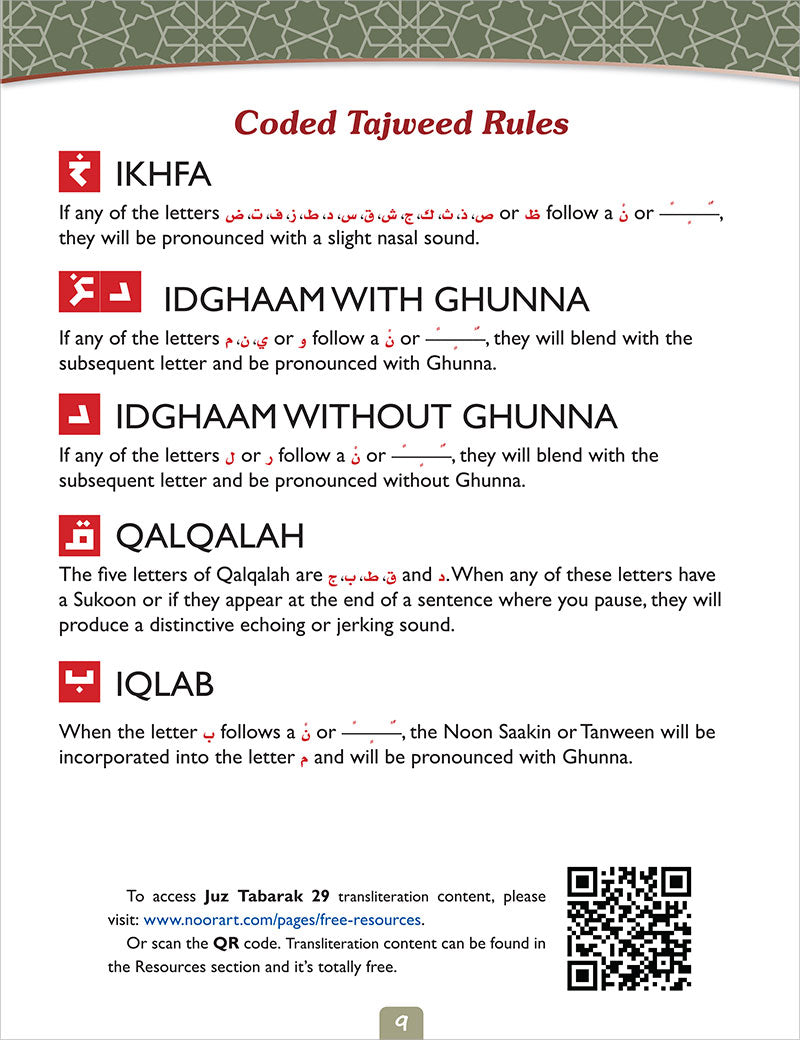 Comprehensive Textbook for Juz Tabarak (29th Juz) of the Holy Qur'an Features: