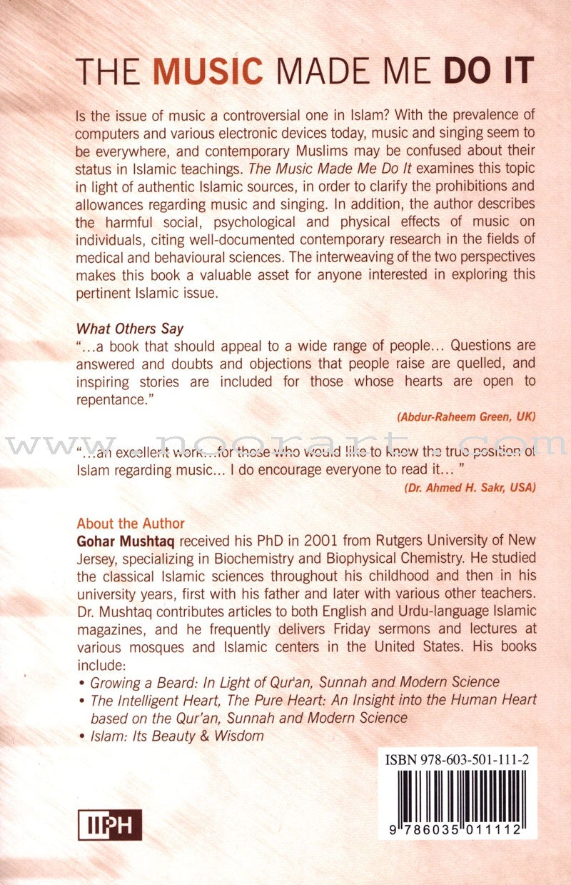 The Music Made Me Do It: An In-Depth Study of Music through Islam and Science examines this topic in light of authentic Islamic sources, in order to clarify the prohibitions and allowances regarding music and singing. In addition, the author describes the harmful social, psychological and physical effects of music on individuals, citing well-documented contemporary research in the fields of medical and behavioral sciences.