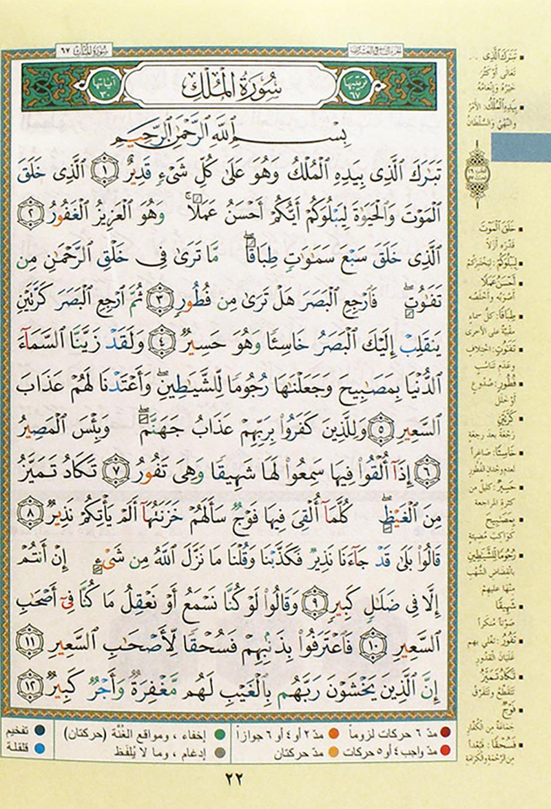 - Color coded letters: to present the Tajweed rules, very good and simple way to learn and apply Tajweed rules.