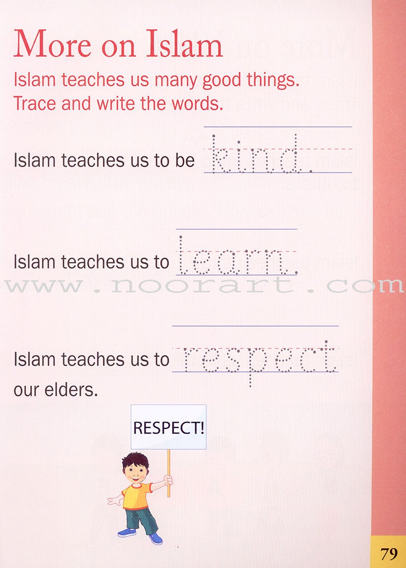 The Islamic Studies: Kindergarten book is for 4–5 year old children. Now a day, Kindergarten is like a new “first” grade—where children learn a lot, but with plenty of fun. The goal of kindergarten is to build good feelings about school and learning. Students begin with very basic curriculum. The book emphasizes the most important academic topic—developing literacy—reading and writing. Islamic Studies for Kindergarten begins by doing the same that a regular school does—building familiarity with various aspects of written and spoken words. The objective is to introduce the basics of Islam through many activities—writing, coloring, cutting, gluing, sorting, listening or sometimes simply playing.